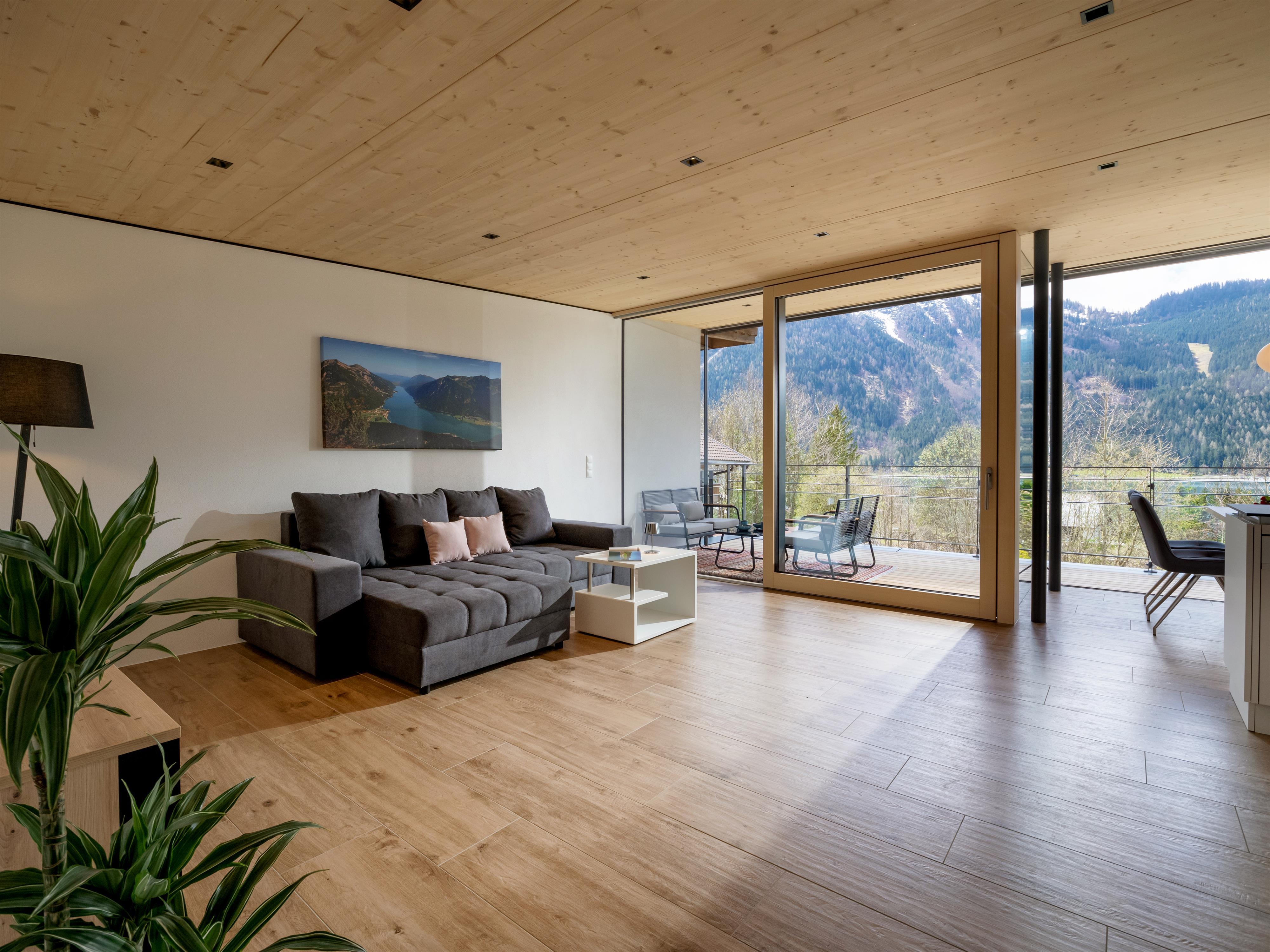 Unsere neue Ferienwohnung Auszeit am See ist ringsum mit großen Fensterfronten ausgestattet. Man hat das Gefühl, das ganze Jahr draußen im Grünen oder in einer Winterlandschaft zu sitzen und ist fasziniert vom wunderschönen Achensee, eingerahmt vom Karwendel-und Rofangebirge.