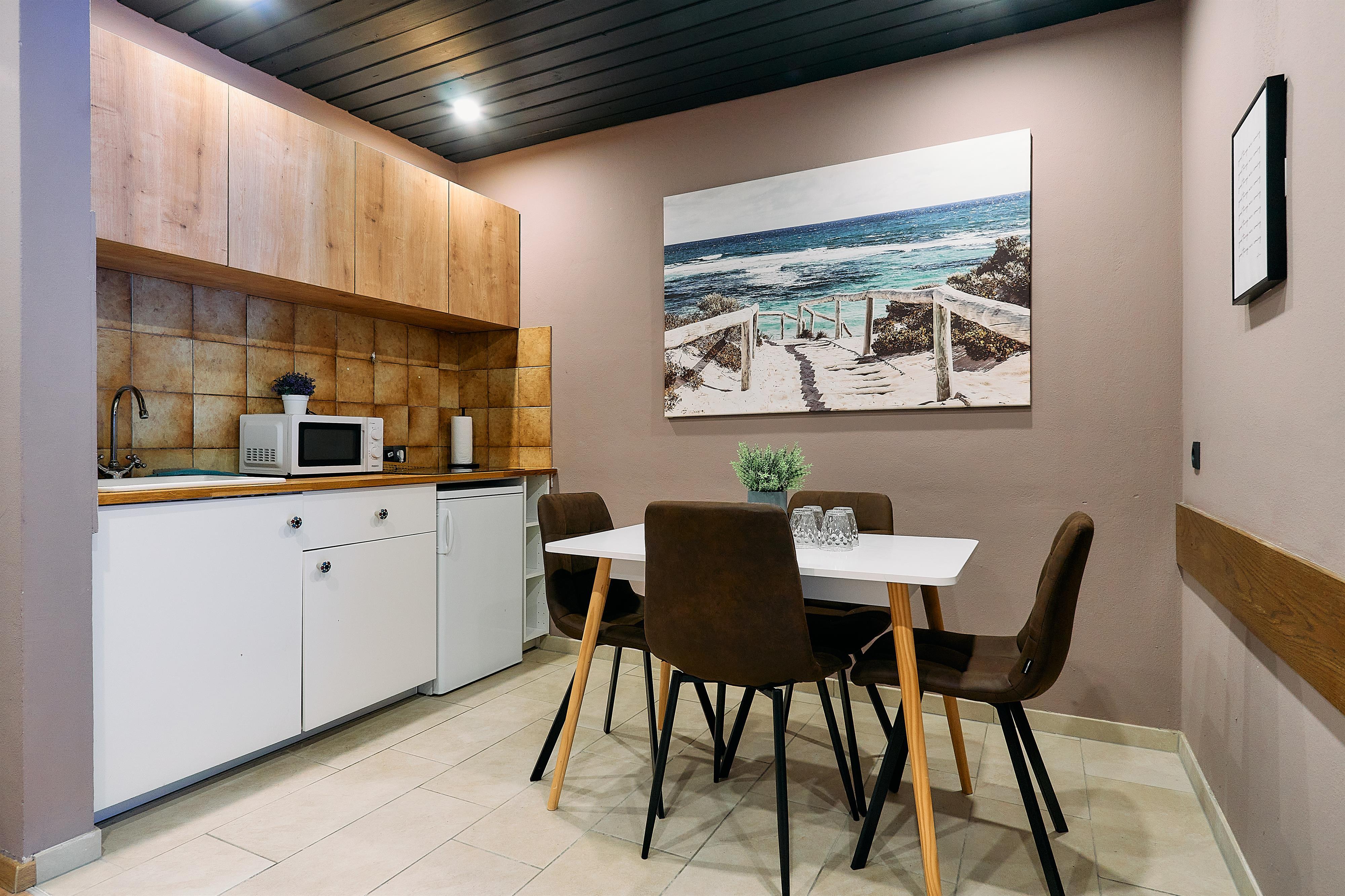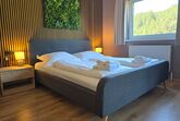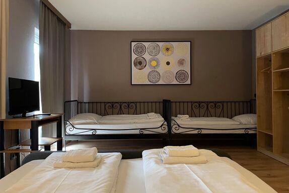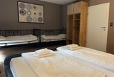 Dich erwartet ein Apartment mit einem Schlafzimmer, Küche und Badezimmer sowie einem Balkon. Es gibt ein Doppelbett und drei Einzelbetten.