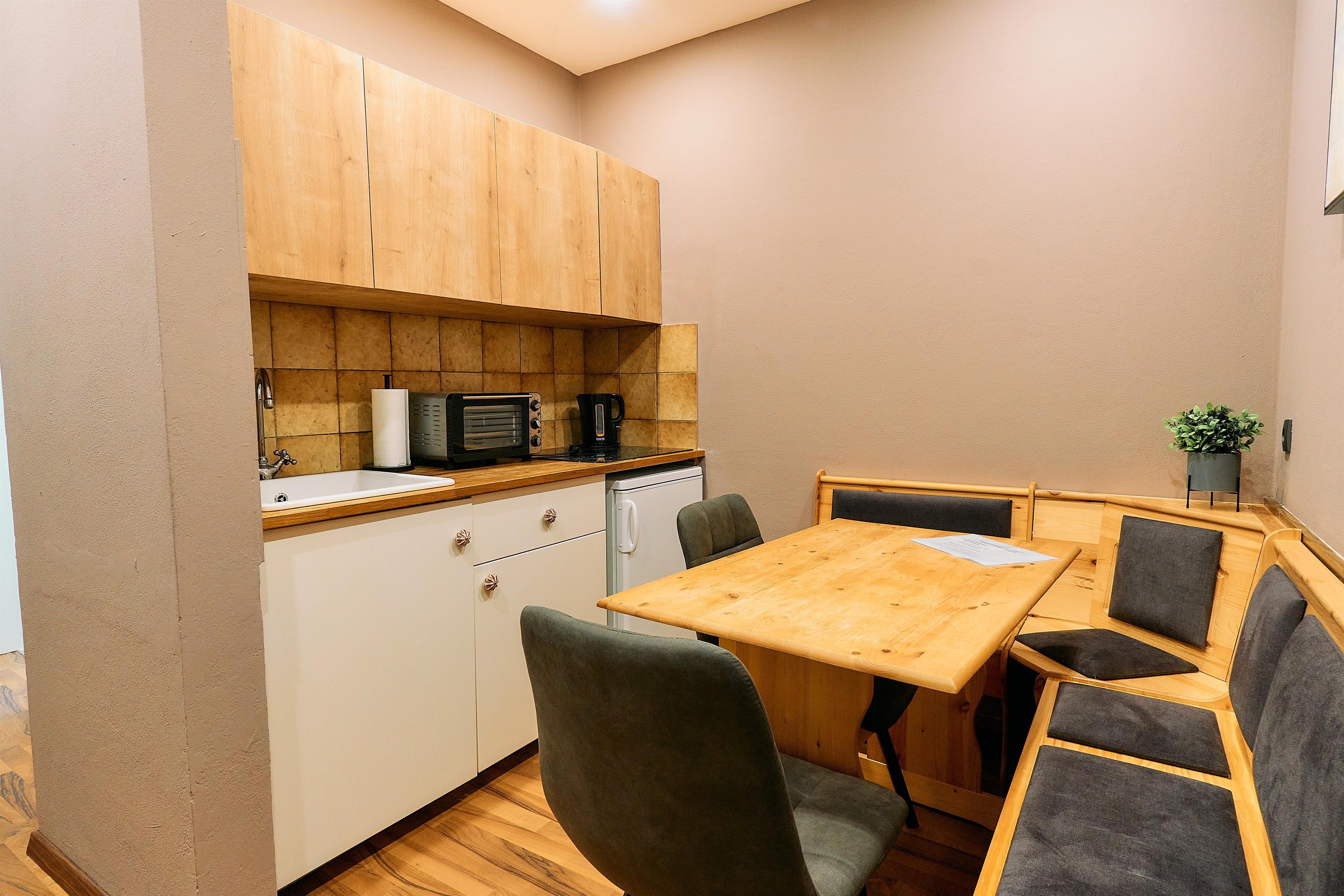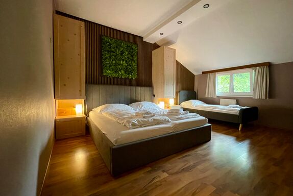 Dich erwartet ein Apartment mit 2 Schlafzimmern, Küche und Badezimmer. Beide Schlafzimmer haben jeweils ein Doppelbett und ein Einzelbett.