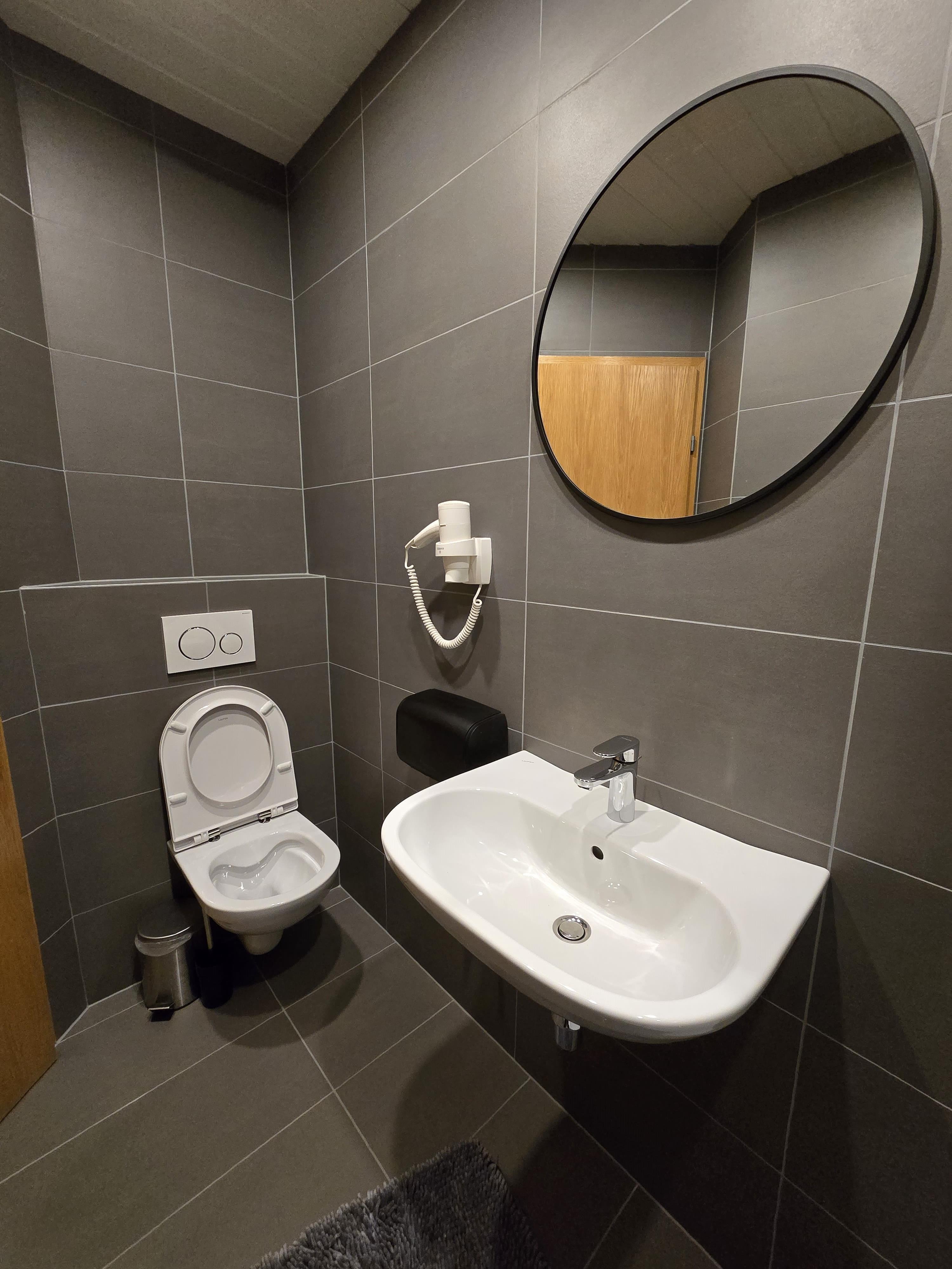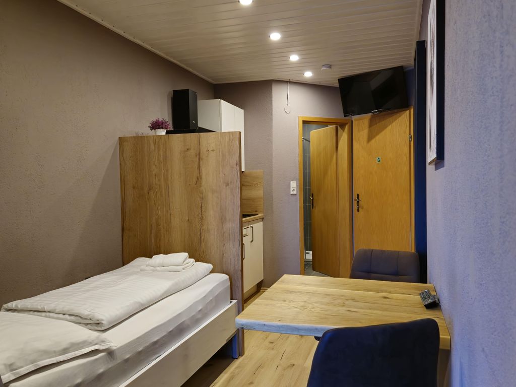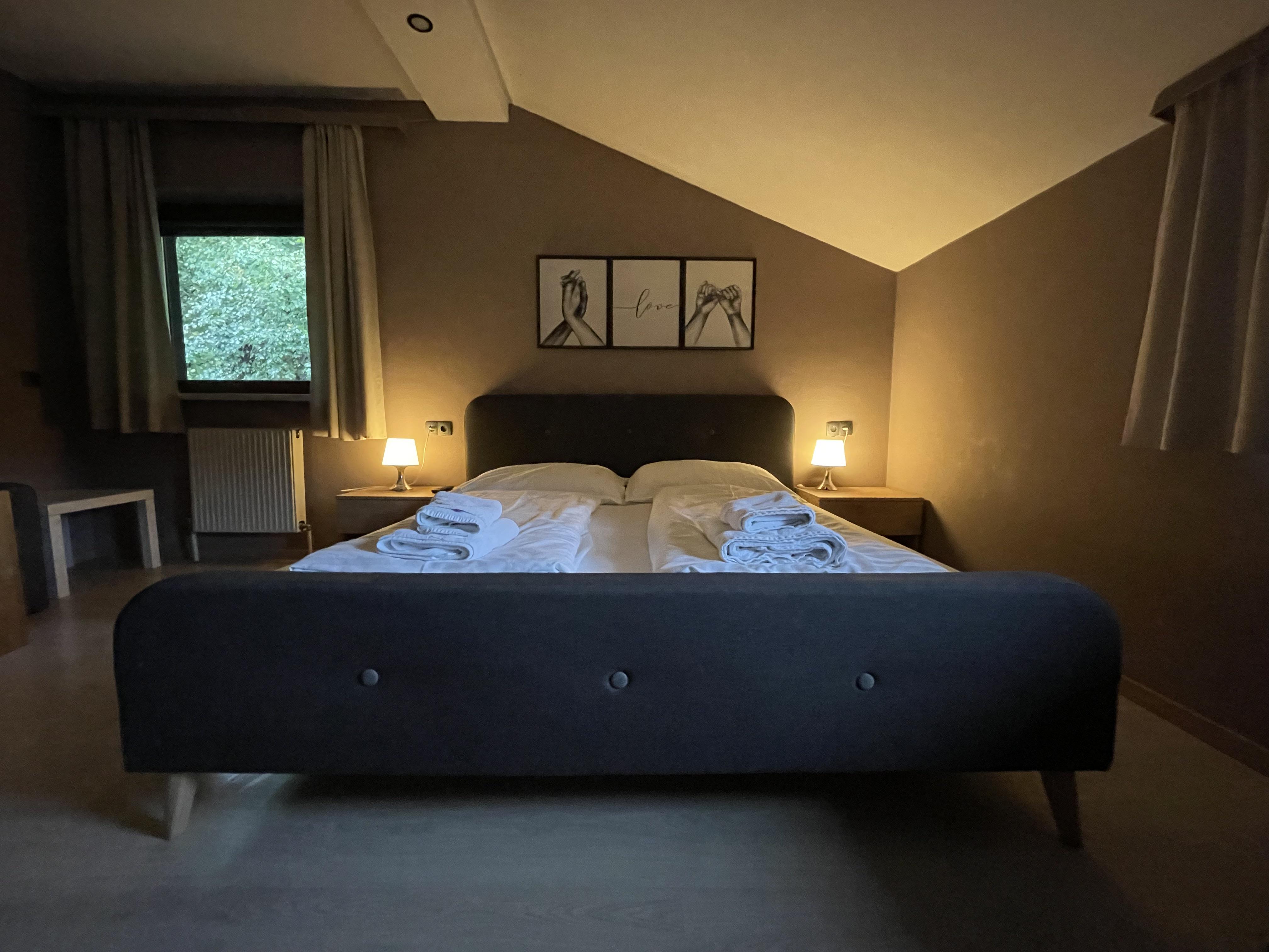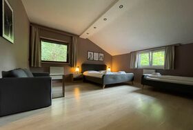 Dich erwartet ein Apartment mit zwei Schlafzimmern, Küche und Badezimmer. Ein Schlafzimmer hat ein Doppelbett und ein Einzelbett. Das kleinere Schlafzimmer hat zwei Einzelbetten.