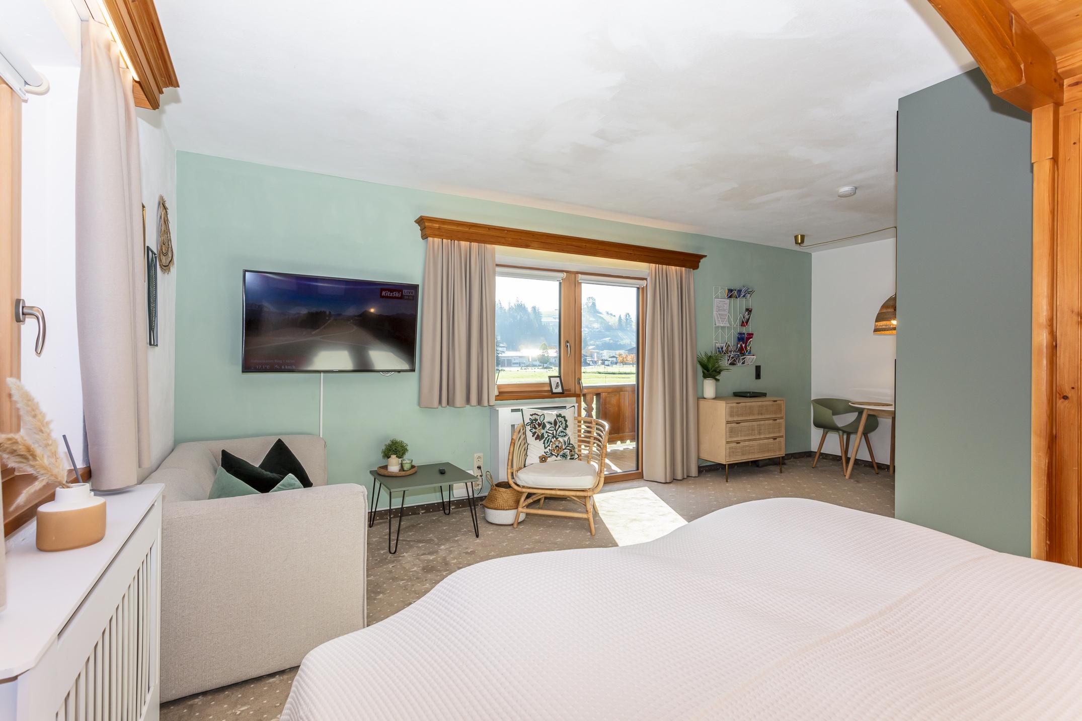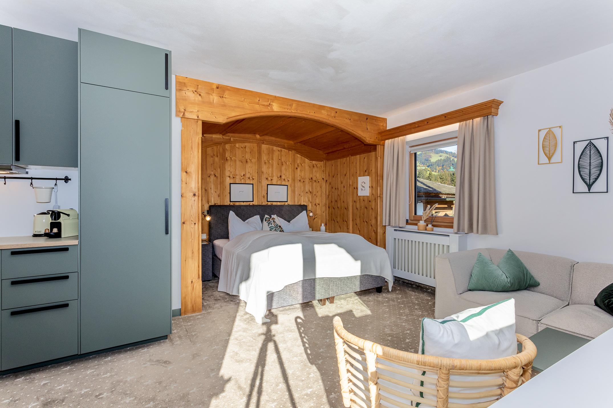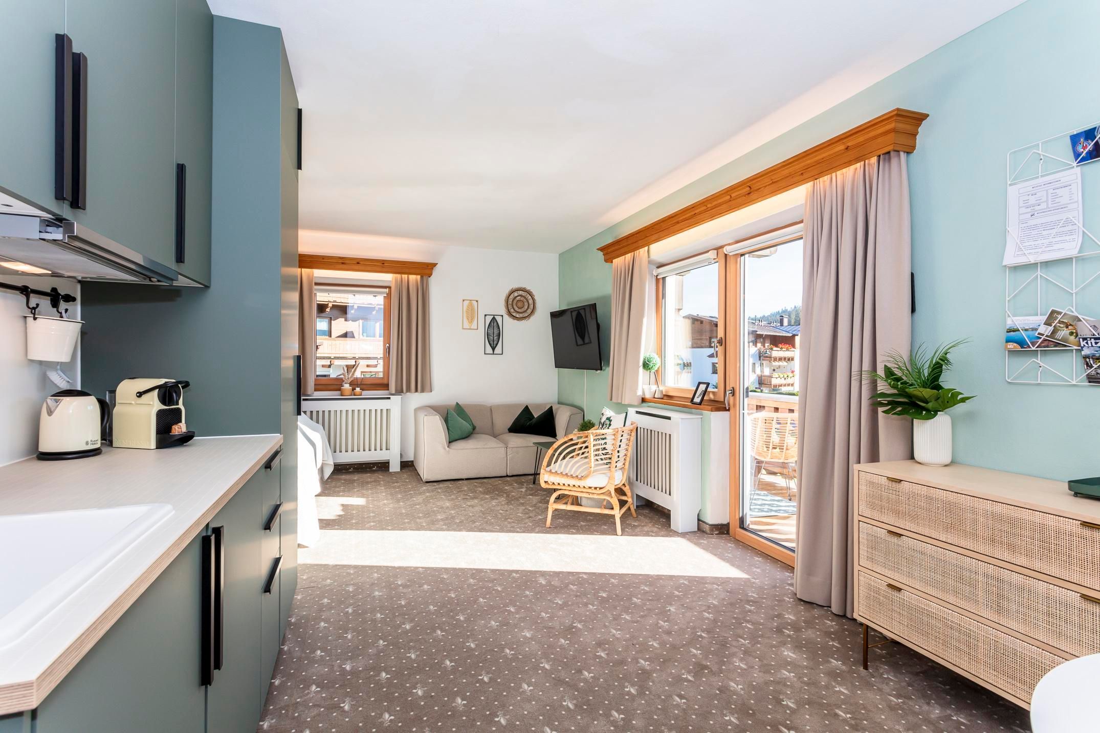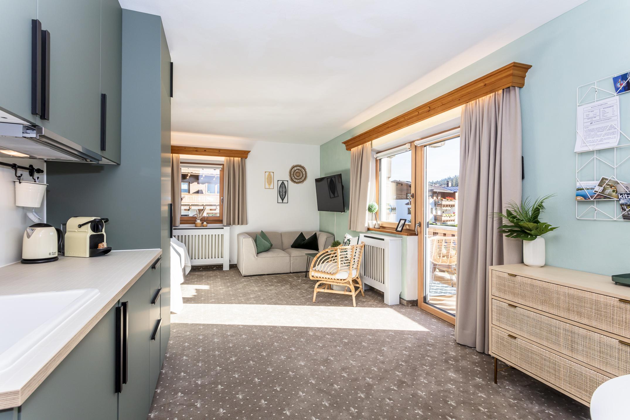 Willkommen in der modernen Ferienwohnung Kaiser 2! Hier erwarten dich auf 40 m² ein stilvolles und komfortables Ambiente. Angefangen von bequemen Betten und einer ausziehbaren Couch bis hin zu einer Kochnische mit Essecke findest du hier alles, was du für Ihren erholsamen Urlaub in den Kitzbüheler Alpen brauchst. Genieße die frische Luft und den herrlichen Ausblick vom Balkon aus. In der Ferienwohnung Kaiser 2 erwartet dich ein Aufenthalt voller Komfort und Gemütlichkeit.