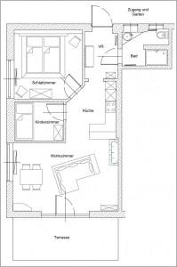 Der Rosengarten ist eines unserer Apartments mit ca. 80m2. Das im Apartment befindet sich im Erdgeschoss und hat einen Ausgang im Innenhof zum Rosengarten als auch eine Ausgang auf die Dorfstrasse wo sich eine große Steinterrasse befindet. Das Apartment ist mit Du/WC, Sat/TV, Vorraum, Wohnküche und einem Seperaten Kinderzimmer mit Etagenbett ausgestattet. Vor dem Apartment befindet sich eine eigene Terrasse aus Holz in den Innenhof.