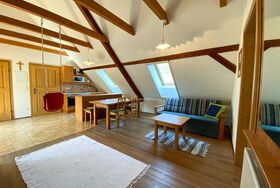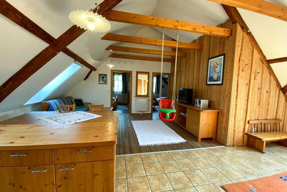 Unsere größte Wohnung mit 2 Schlafzimmern, mit sichtbarem bis in den Spitzboden offenen alten Dachstuhl, tischlergefertigten Vollholzmöbel und geölten Lärchenböden.