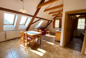 Gemütliches Wohnen im ehemaligen Heuboden mit tischlergefertigten Vollholzmöbel, geölten Lärchenböden, sichtbarem bis in den Spitzboden offenen alten Dachstuhl.