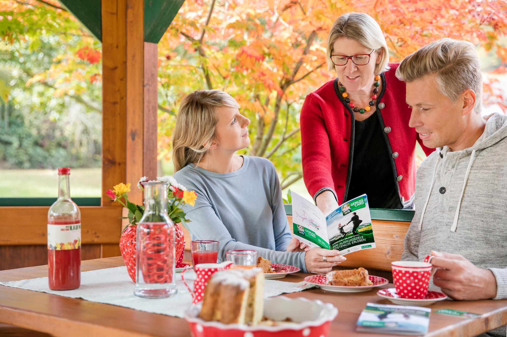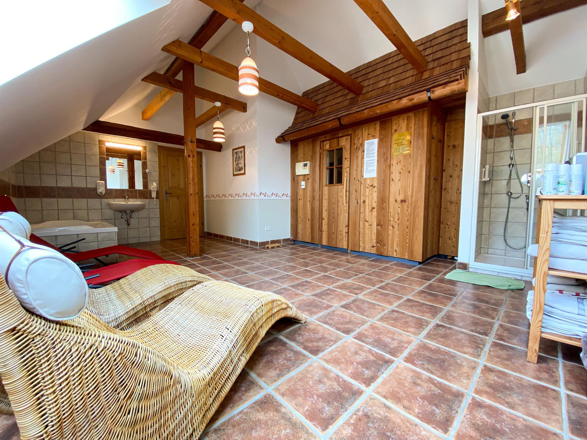 Zum weiteren Angebot zählen ein Frühstücksraum mit Getränkekühlschrank, eine Produktecke mit regionalen Produkten, sowie eine Sauna mit Entspannungsraum. Im großen Garten mit Pavillon, Spielplatz, Hasen und Schafe, Gokarts, Trettraktor, Fußballtor, Tischtennistisch, usw. können sich Kinder so richtig austoben.