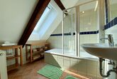 Unsere größte Wohnung mit 2 Schlafzimmern, mit sichtbarem bis in den Spitzboden offenen alten Dachstuhl, tischlergefertigten Vollholzmöbel und geölten Lärchenböden.