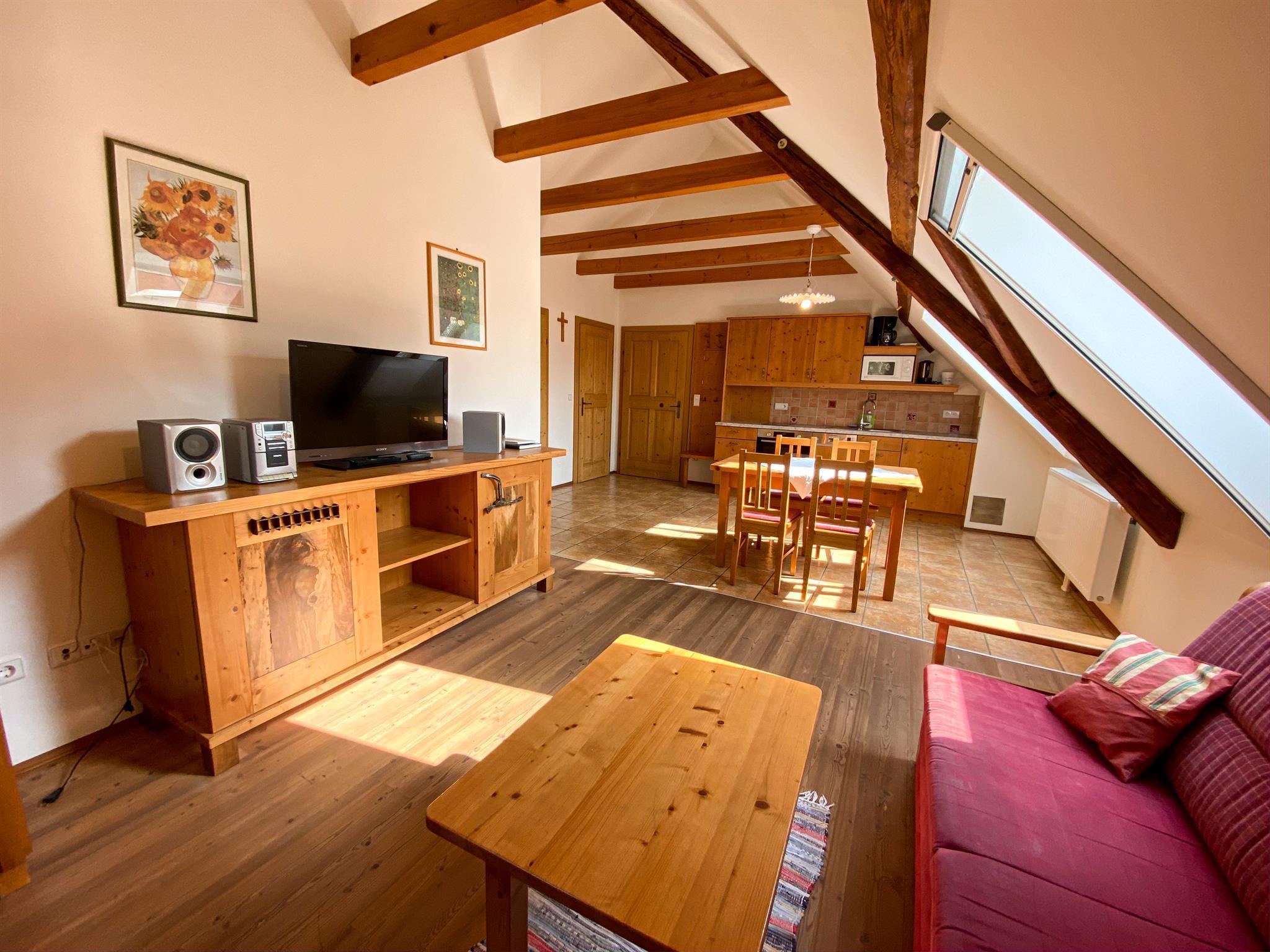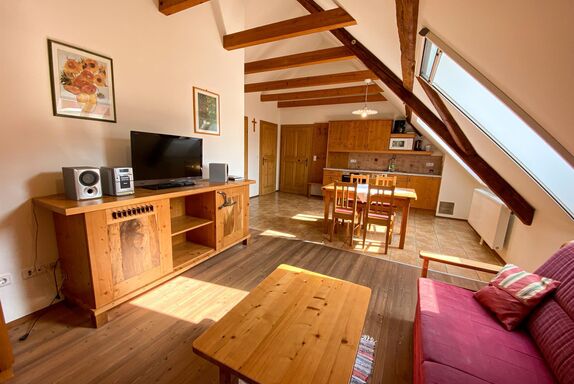 Gemütliches Wohnen im ehemaligen Heuboden mit tischlergefertigten Vollholzmöbel, geölten Lärchenböden, sichtbarem bis in den Spitzboden offenen alten Dachstuhl.