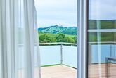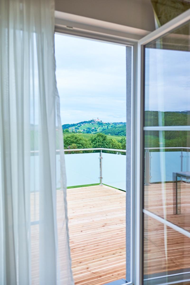 Doppelzimmer Zirbe (rund 32 Quadratmeter) mit Terasse mit Ausblick auf St. Anna am Aigen. Das Zimmer ist klimatisiert und mit einem Doppelbett aus Zirbenholz, Parkettboden, Massivholzmöbeln, WLAN, Flachbild-Fernseher, Dusche und WC ausgestattet. Das Zirbenbett soll für einen ruhigen und gesunden Schlaf sorgen.