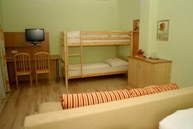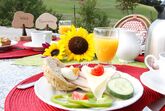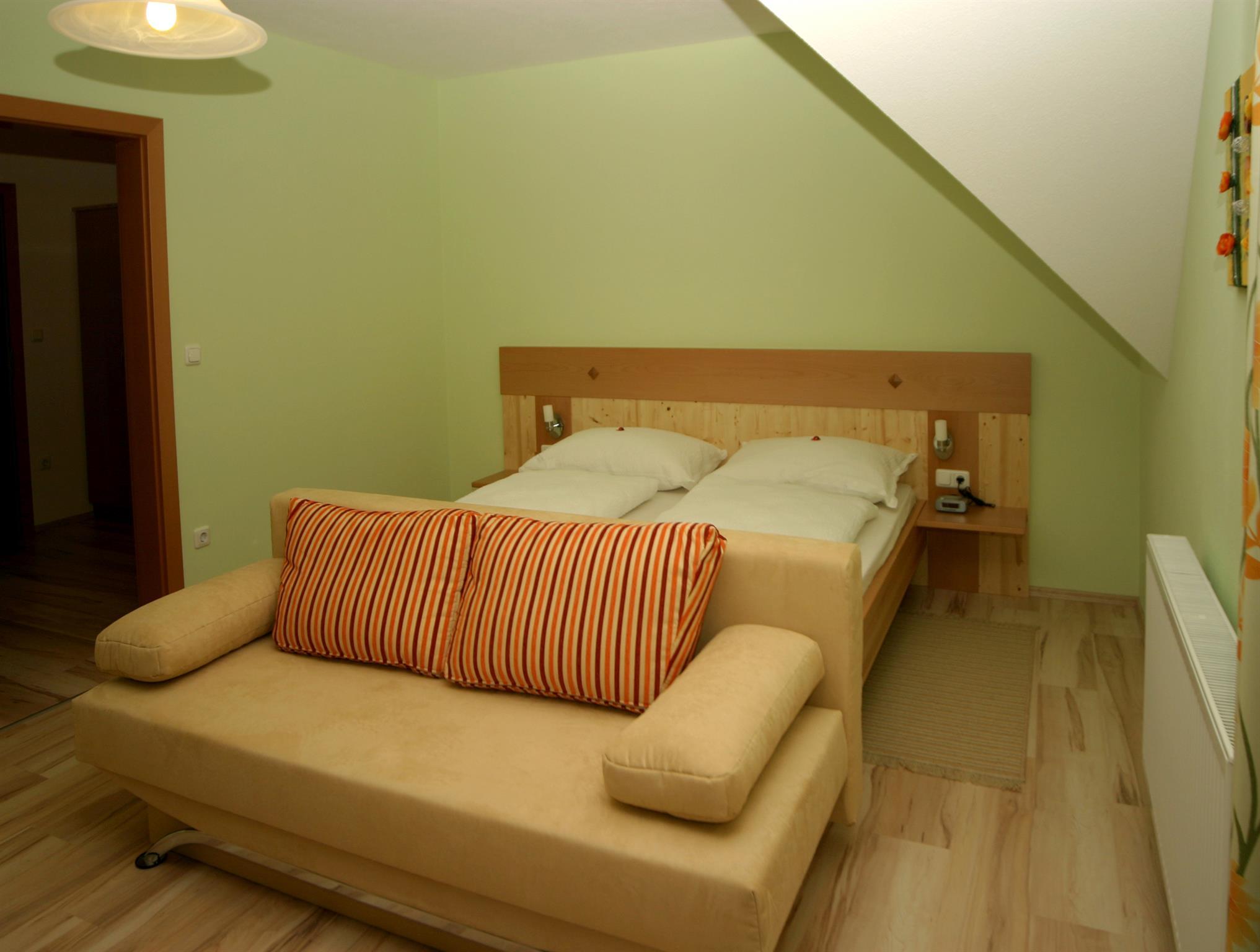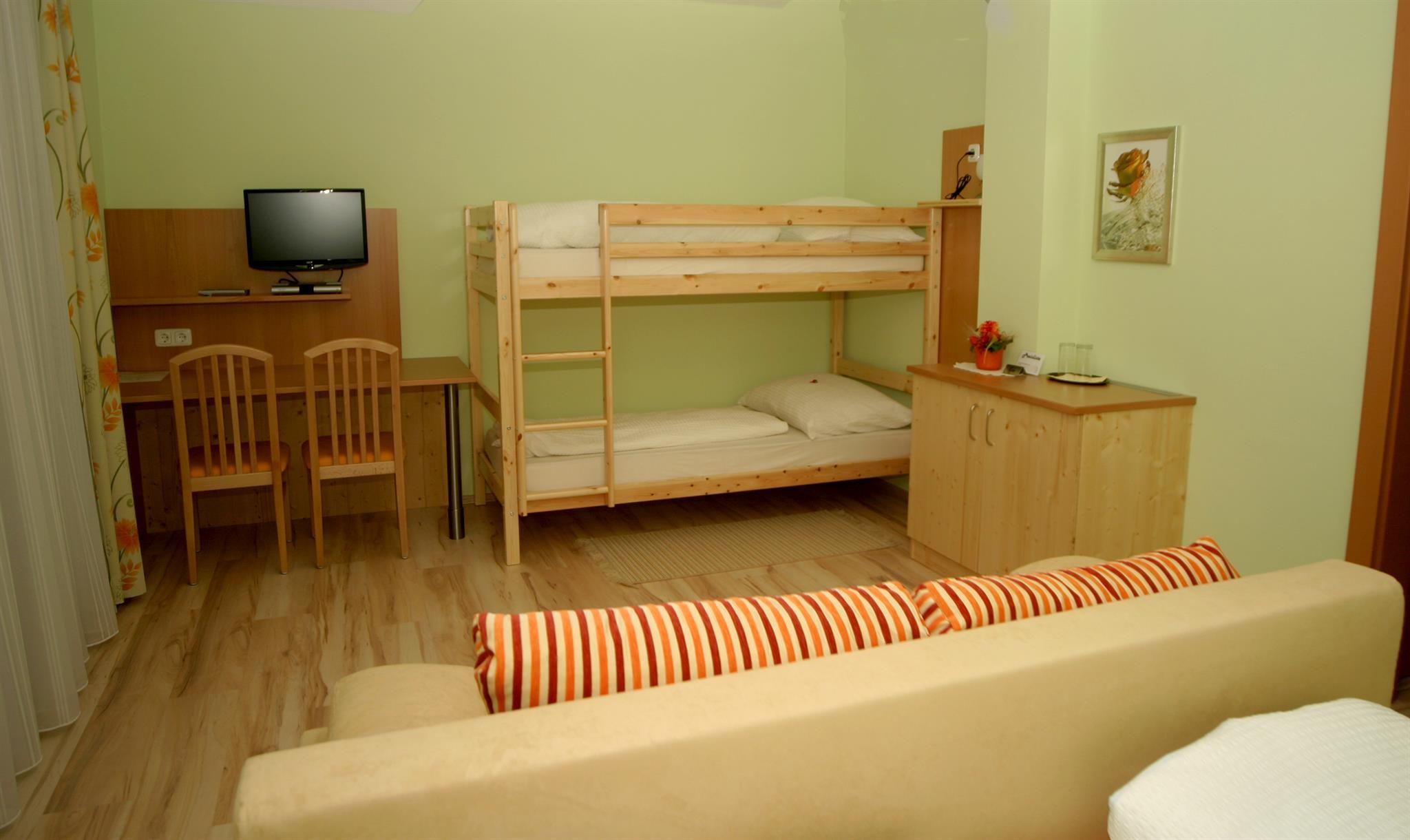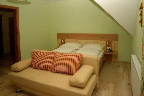 Wenn Sie nach einer erholsamen Nacht einen wunderschönen Morgen genießen wollen, bietet unser Panoramazimmer genau das Richtige. Begutachten Sie den Morgentau über dem großen Balkon. Dieses geräumige Zimmer, eingerichtet in Buche, bietet viel Platz und ist somit ideal als Familienzimmer geeignet. In moderaten Grün- und Orange-Tönen kann man einmal so richtig abschalten und eins mit der Natur werden. Ein Erlebnis für die ganze Familie...