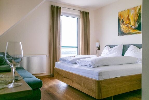 Geschmackvoll eingerichtetes Doppelzimmer mit einem Balkon der zum Entspannen mit einem Glaserl Wein einlädt.
