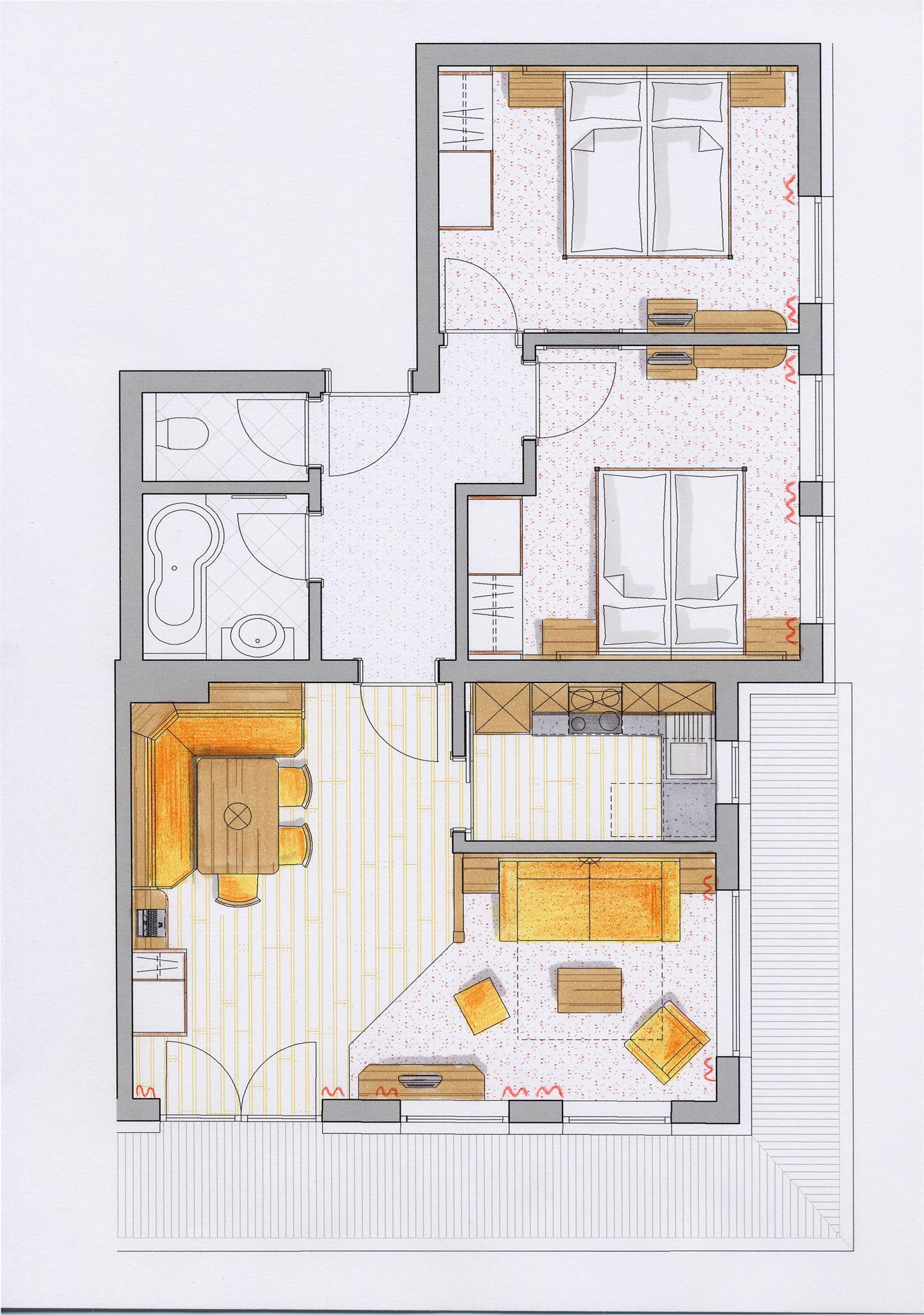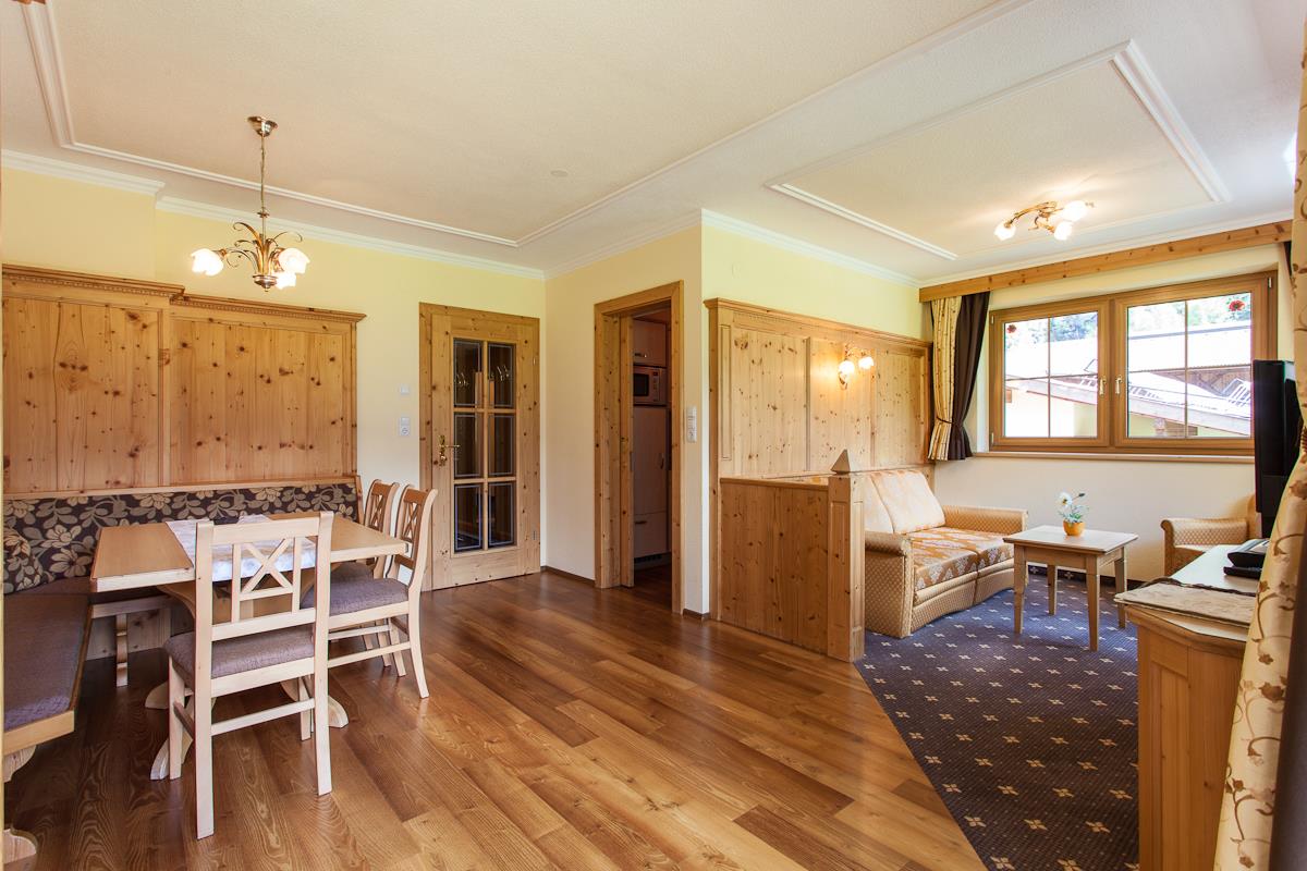Unser Appartement Alpenmohn 83,00 m² befindet sich im 1. Stock und bietet 2 Schlafzimmer mit Doppelbett und 2 Einzelbetten, ein Wohnzimmer mit Schlafsofa, eine Küche, ein Badezimmer und ein separates WC.