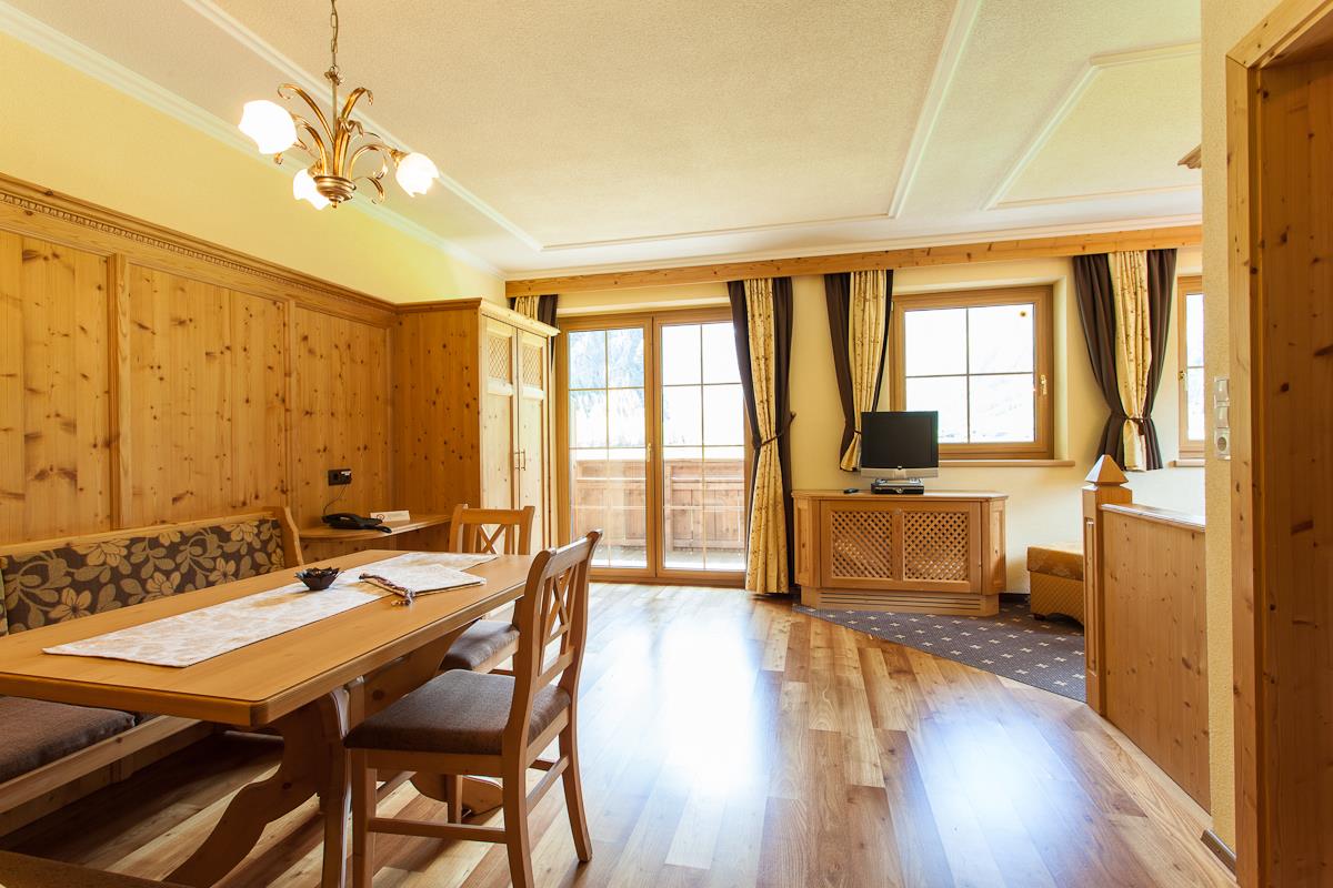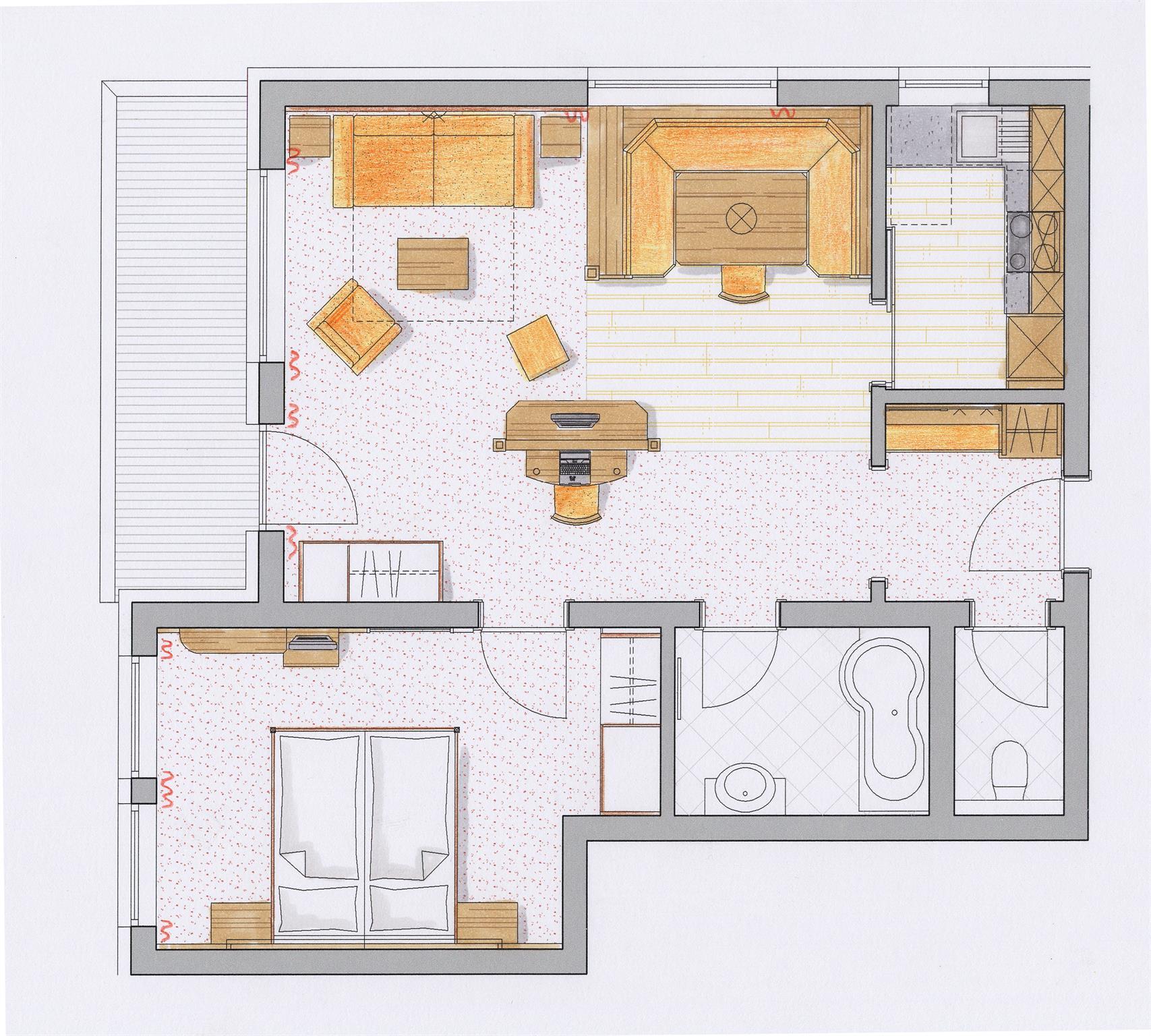 Unser Appartement Nelke (ca. 58 m²) befindet sich im 1. Stock und bietet ein Schlafzimmer mit Doppelbett, ein Wohnzimmer mit Schlafsofa, eine Küche sowie ein Badezimmer und ein separates WC.