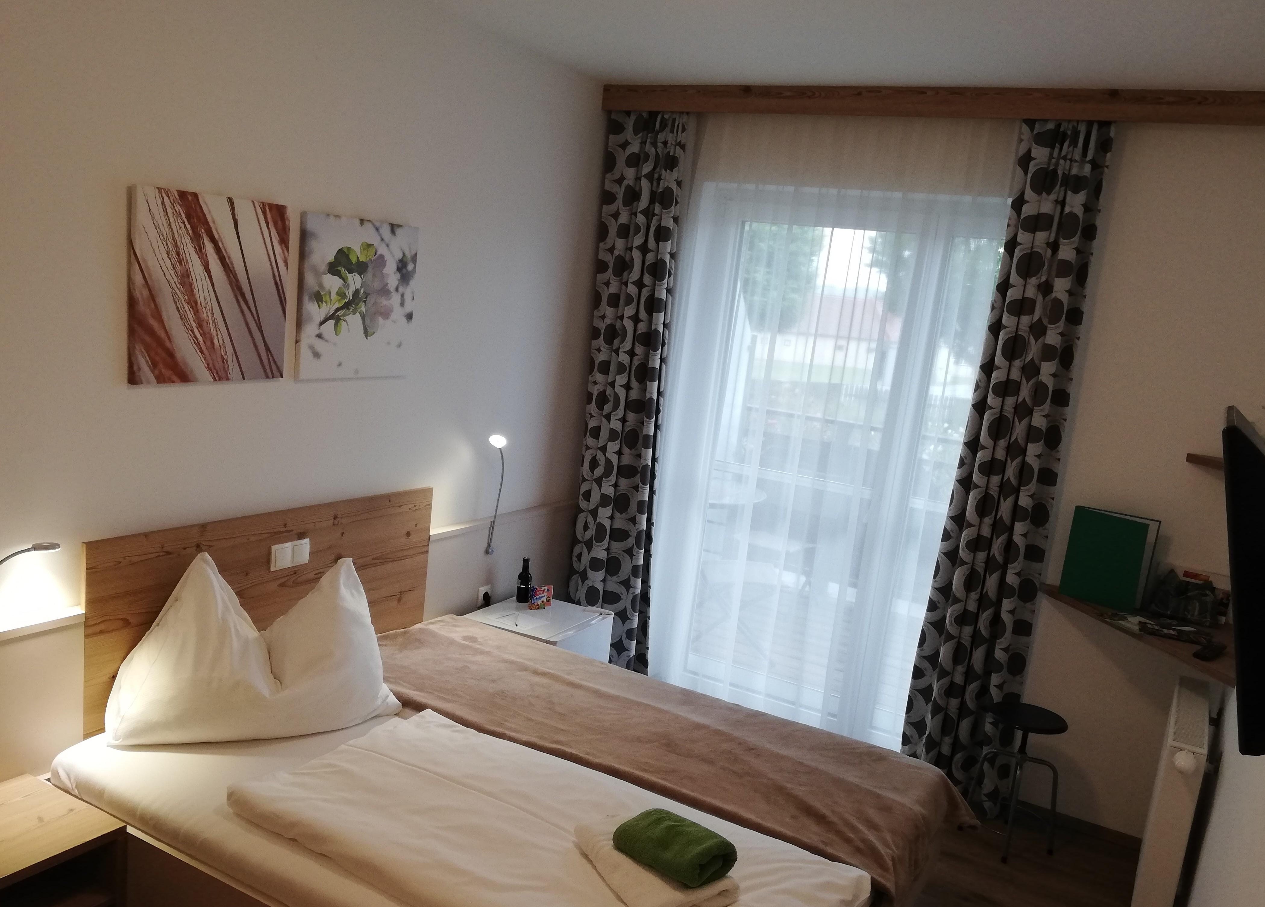 Großzügiges Komfort-Einzelzimmer, neuwertig, mit Balkon, Bad mit Dusche und WC, Minibar im Zimmer, WLAN gratis, Flat-TV, Parkplatz gratis
