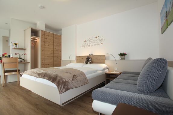 Die Doppelzimmer sind modern und sehr geschmackvoll vom Tischler ausgestattet. Alle Zimmer haben eine Minibar, SAT-TV, zum Teil Terrasse oder Balkon. Dusche und WC.