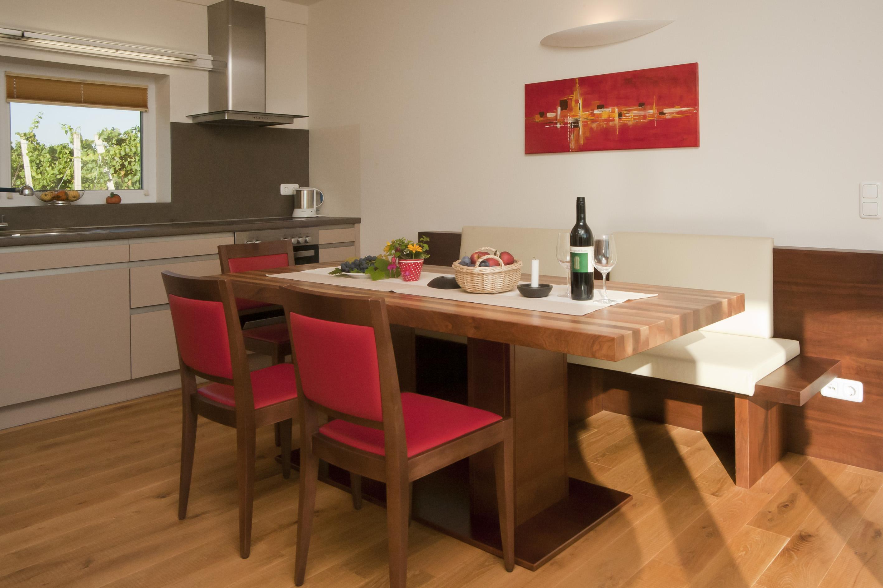 Tischlergefertigte Vollholzmöbel in Zirbe und Nuss, Dielenböden in Eiche, eine gemütliche Winzerstube, eine schwebende Weingartenterrasse, eigene Sauna und hochwertige tueri-Lebensenergiebetten von Tischlermeister Franz Gross sind genau das Richtige für den anspruchsvollen Gast, der seinen Urlaub in vollen Zügen genießen möchte.