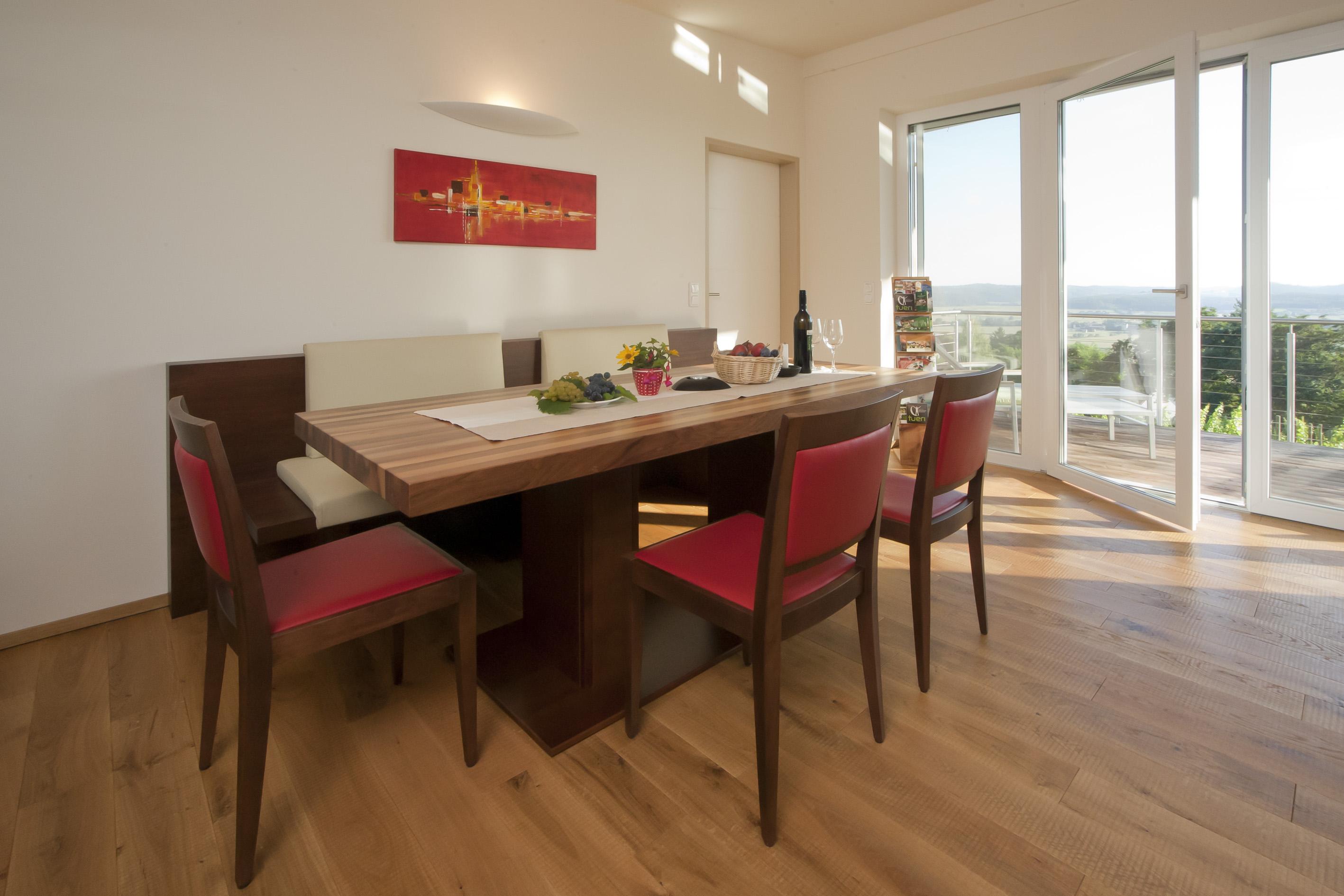 Tischlergefertigte Vollholzmöbel in Zirbe und Nuss, Dielenböden in Eiche, eine gemütliche Winzerstube, eine schwebende Weingartenterrasse, eigene Sauna und hochwertige tueri-Lebensenergiebetten von Tischlermeister Franz Gross sind genau das Richtige für den anspruchsvollen Gast, der seinen Urlaub in vollen Zügen genießen möchte.