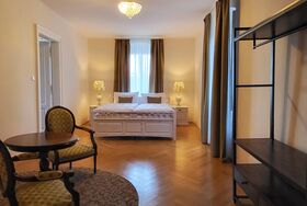 Die Suite umfasst den gesamten zweiten Stock des Turmes und ist über einen eigenen Eingang im Ostflügel des Gebäudes zugänglich. Die originale Holzstiege aus der Gründerzeit, über welche die Suite zugänglich ist (kein Lift vorhanden), erzählt Stufe um Stufe knarrend hörbar ein wenig die Geschichte dieses wunderschönen Hauses
