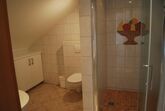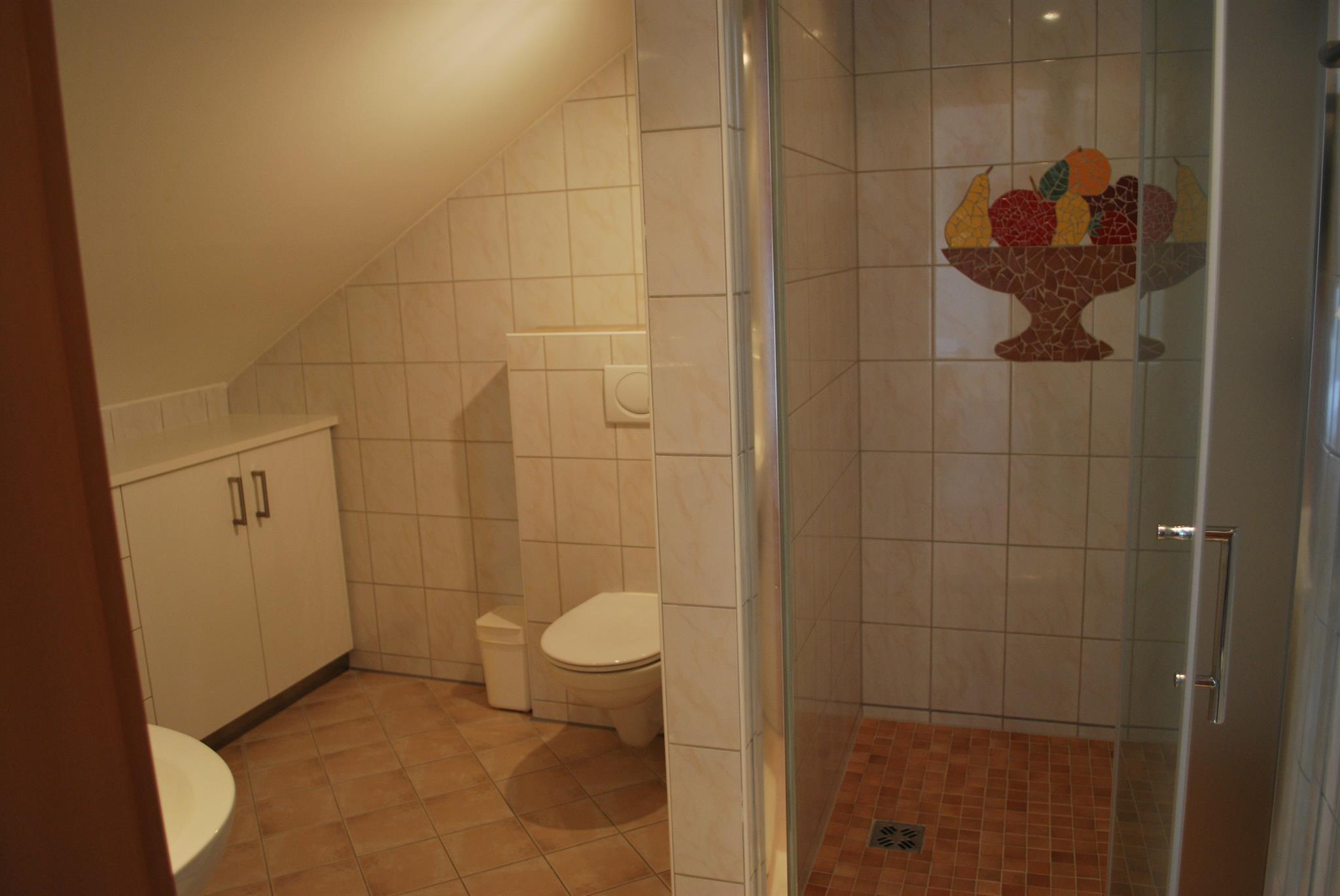 Ruhiges Doppelzimmer mit großzügigem Badezimmer mit Dusche und WC. Fernseher mit SAT-Anschluss. Die Dachflächenfenster bieten einen Ausblick auf den Sternenhimmel.