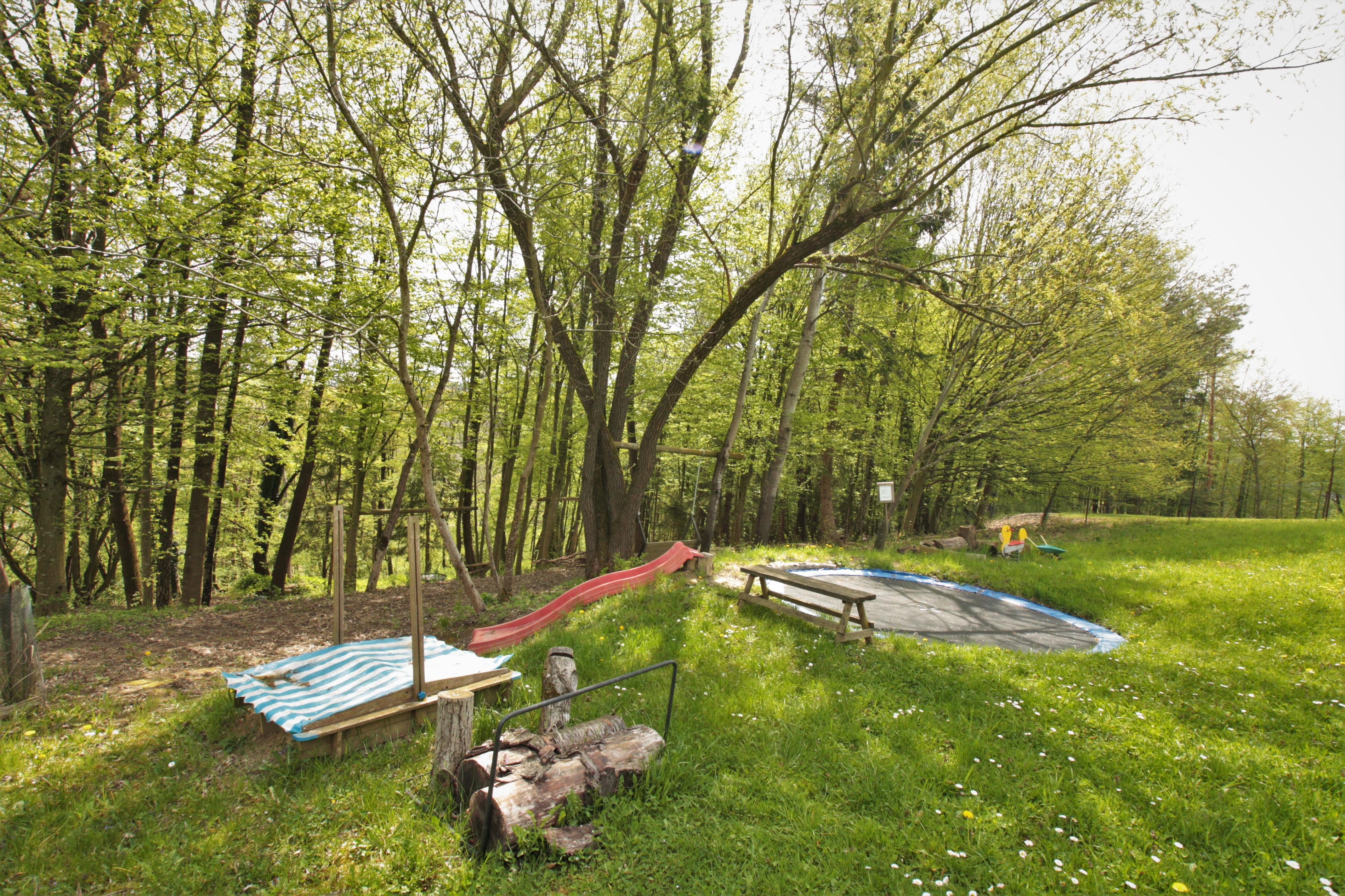 Der angrenzende kleine Wald bietet Entspannung pur beim Waldbaden. Am Waldesrand erfreuen sich Kinder am Trampolin, beim Sandspielen und Schaukeln.