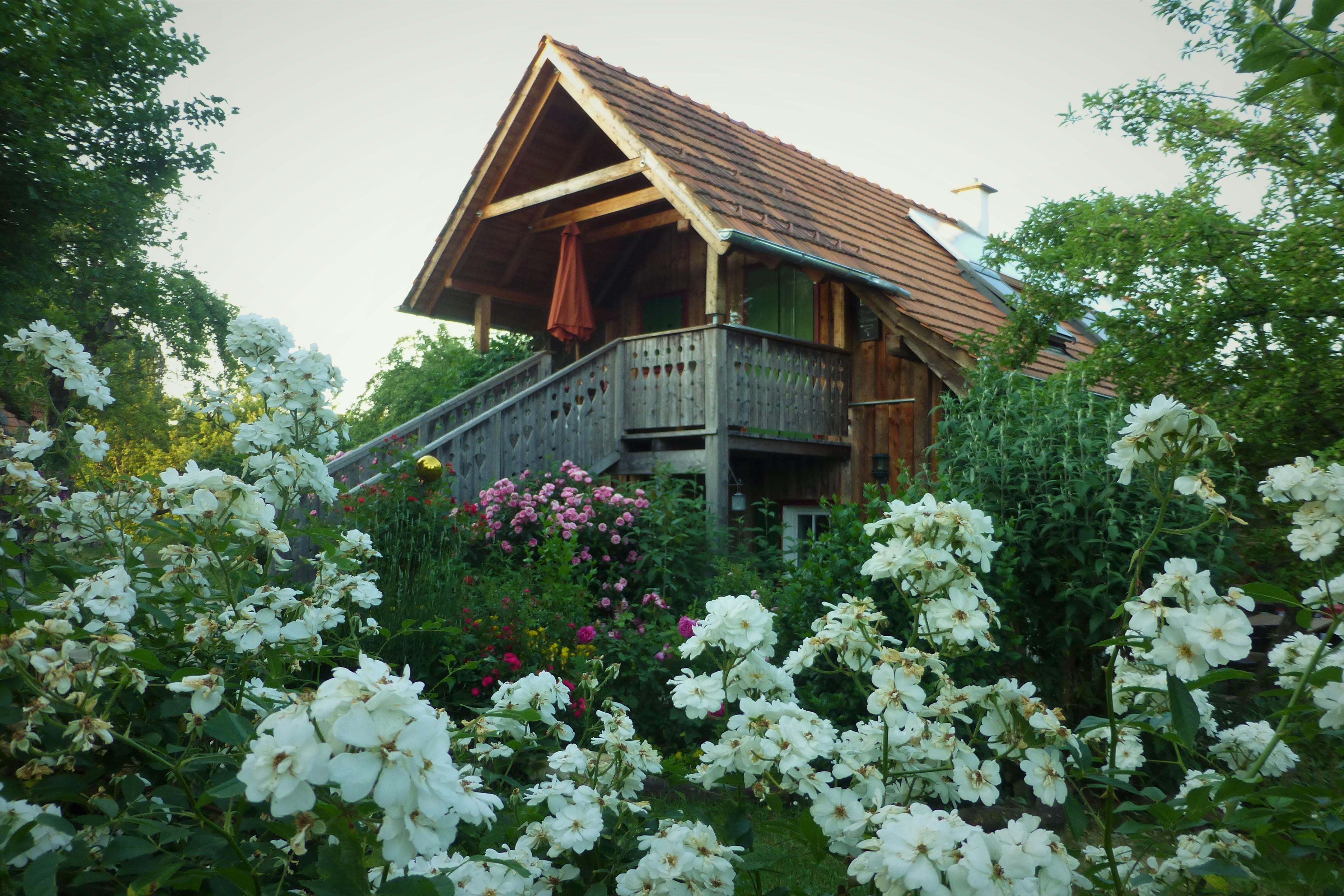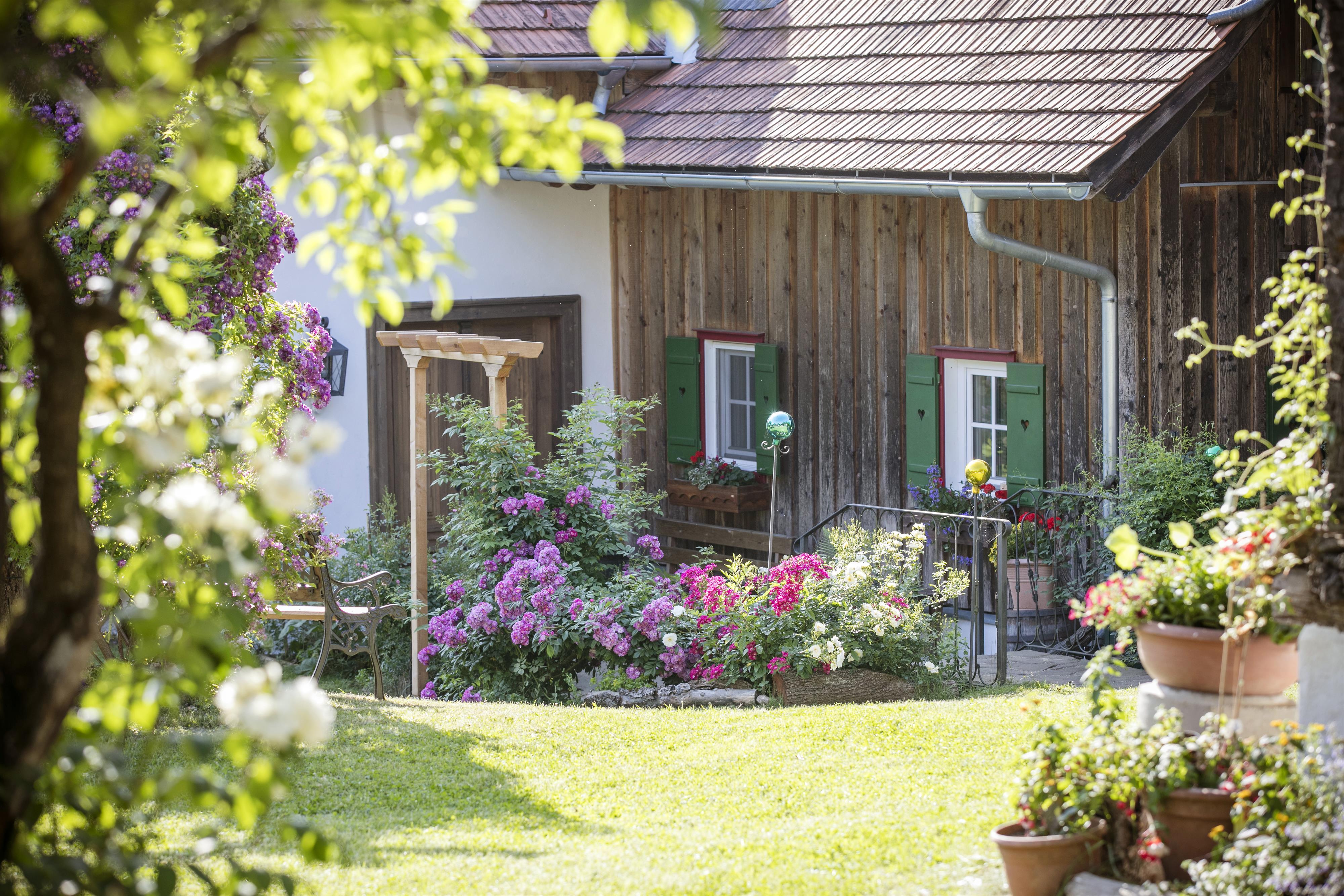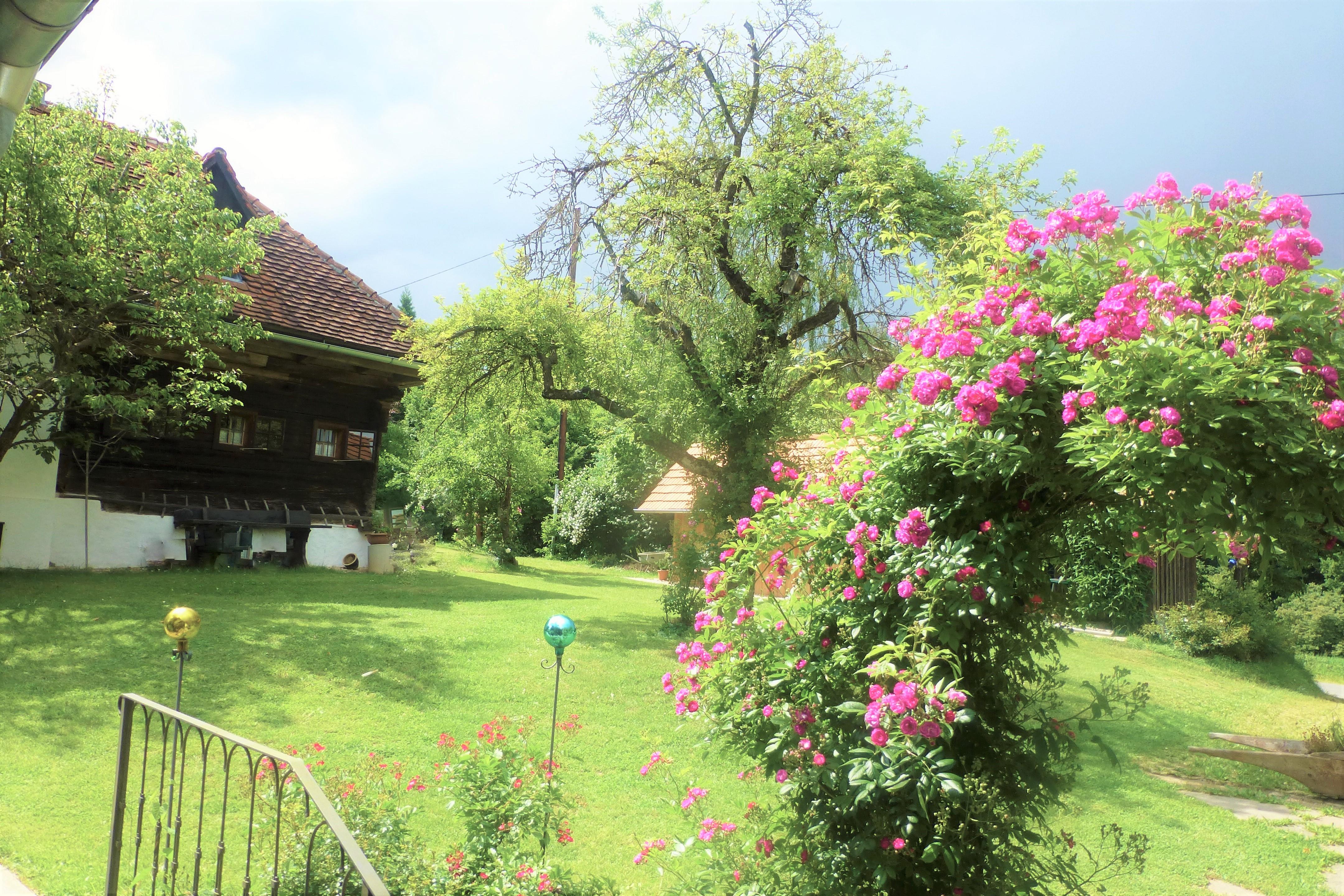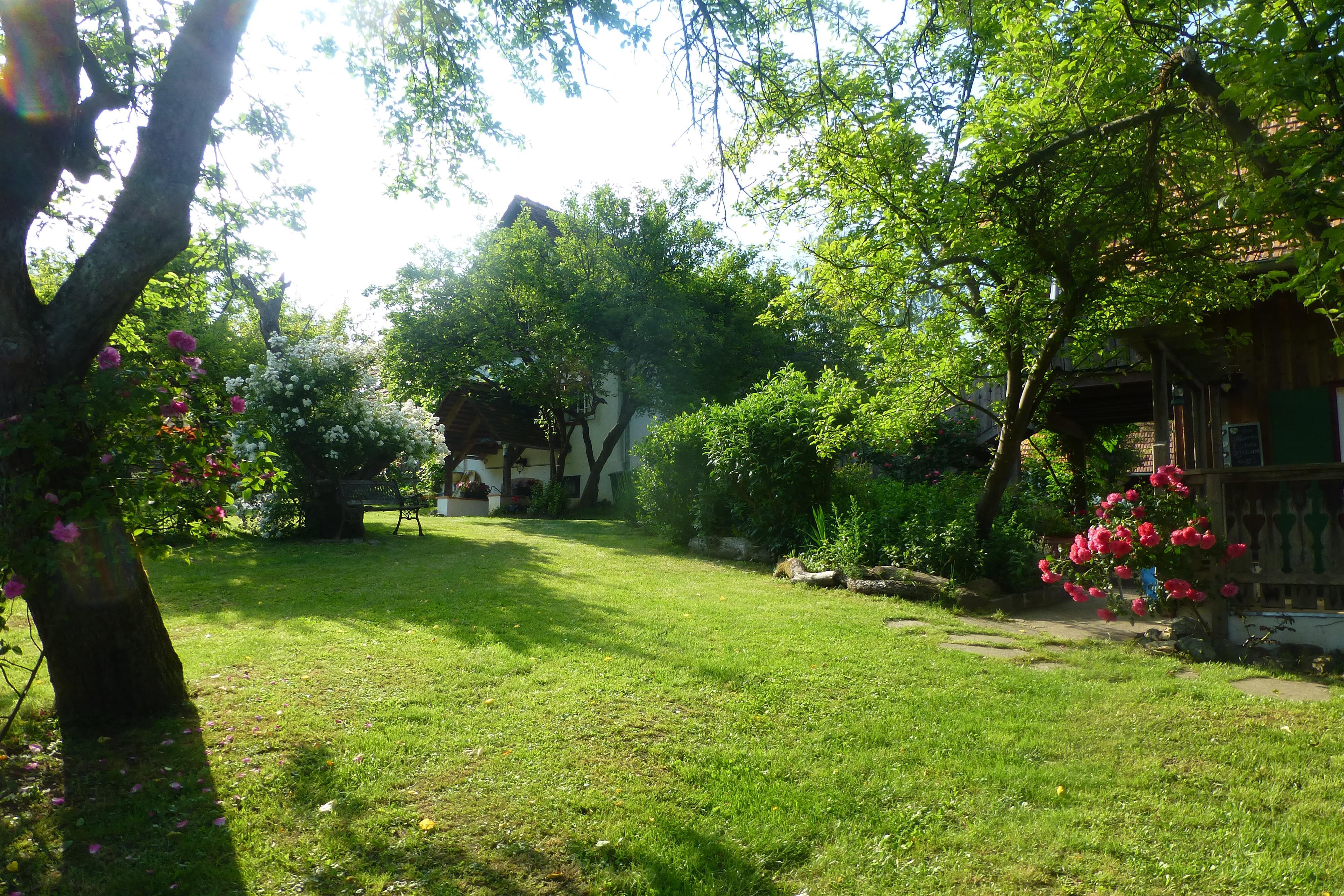 In unserem großen Naturgarten blühen unzählige Blumen wie Rosen und Sträucher, die dazu einladen, durch das grüne Paradies zu schlendern und die Seele baumeln zu lassen. Viele Sonnen- und Schattenplätze genießen Sie im Liegestuhl oder in der Hängematte.