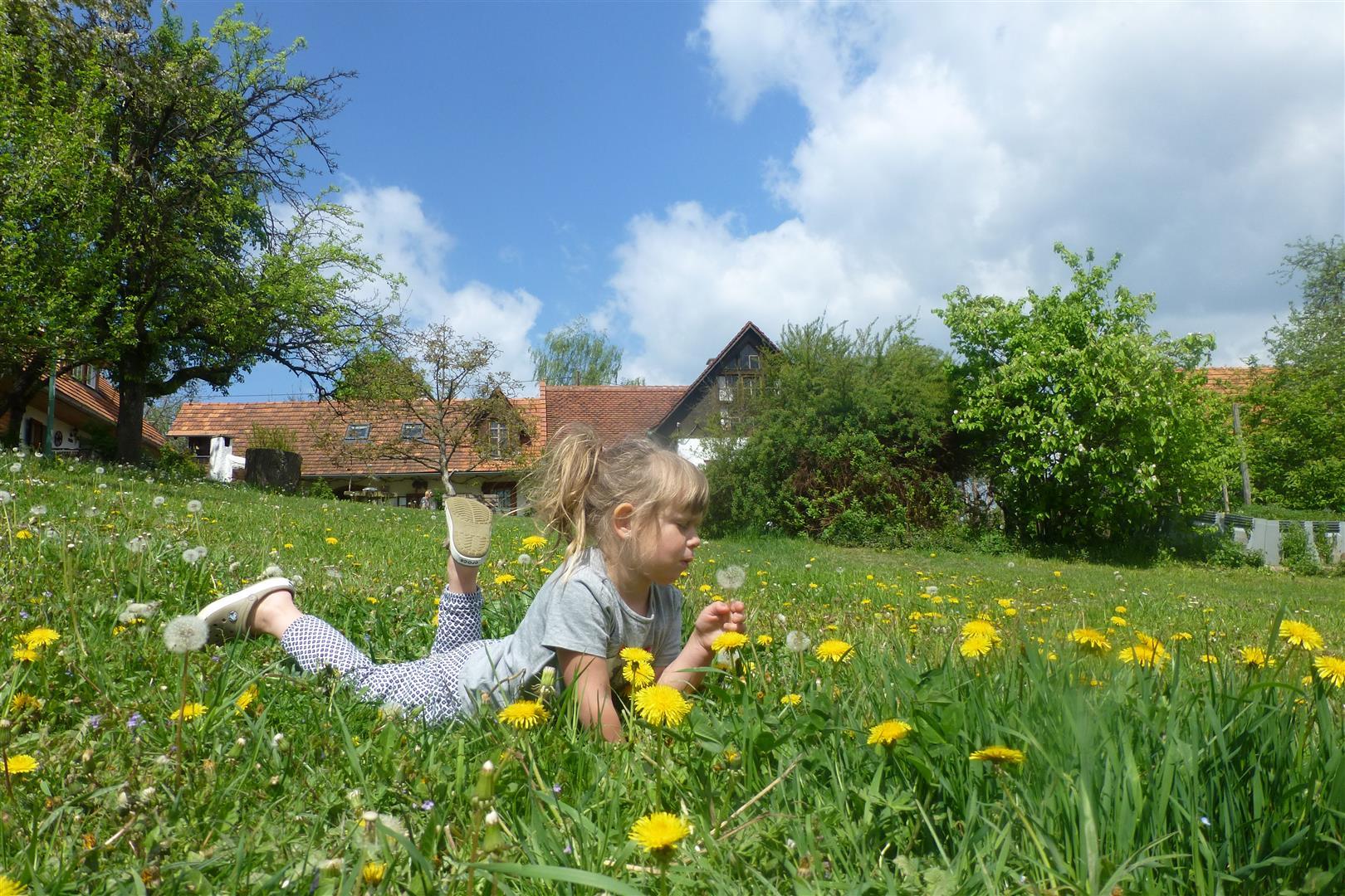 Der angrenzende kleine Wald bietet Entspannung pur beim Waldbaden.  Am Waldesrand erfreuen sich Kinder am Trampolin, beim Sandspielen und Schaukeln.
