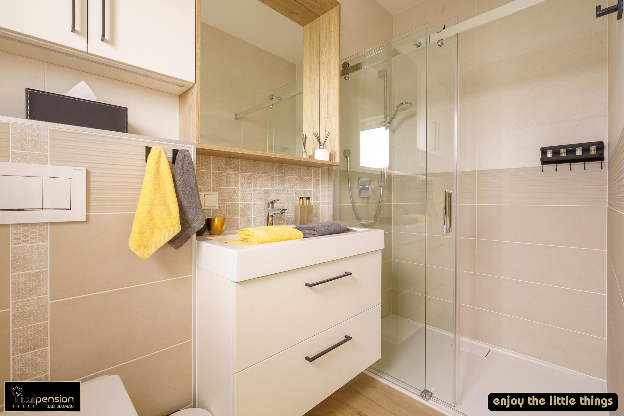 • Komfort Badezimmer mit flacher Duschtasse 140x90, Waschbecken und WC sowie Dusch- und Handtüchern