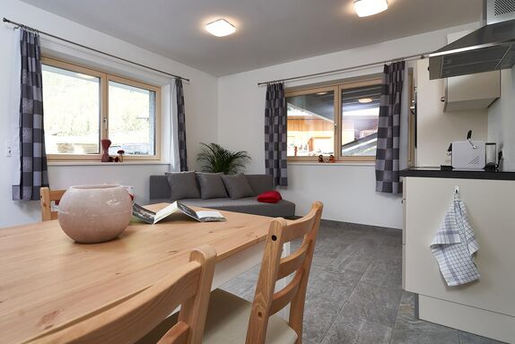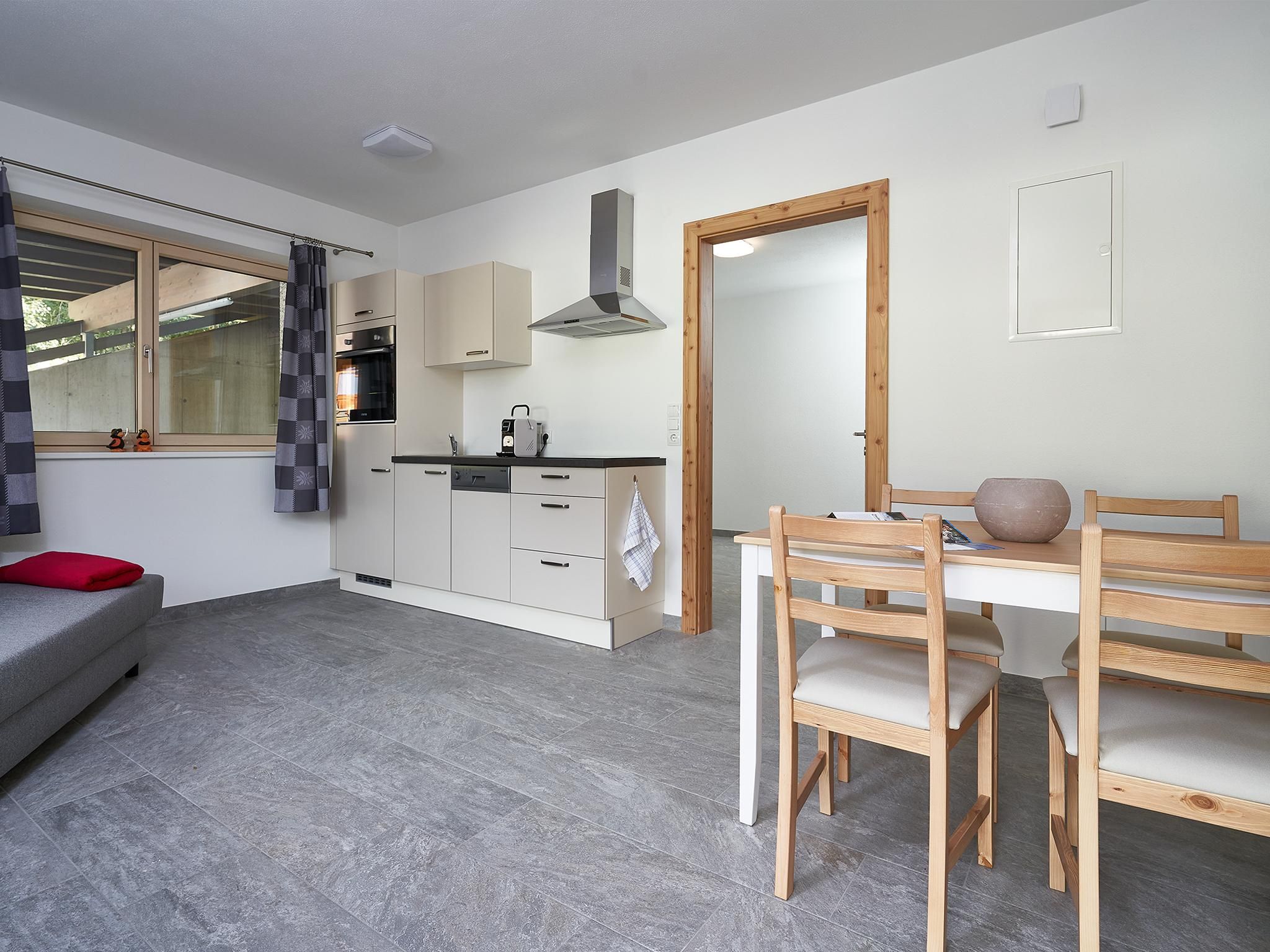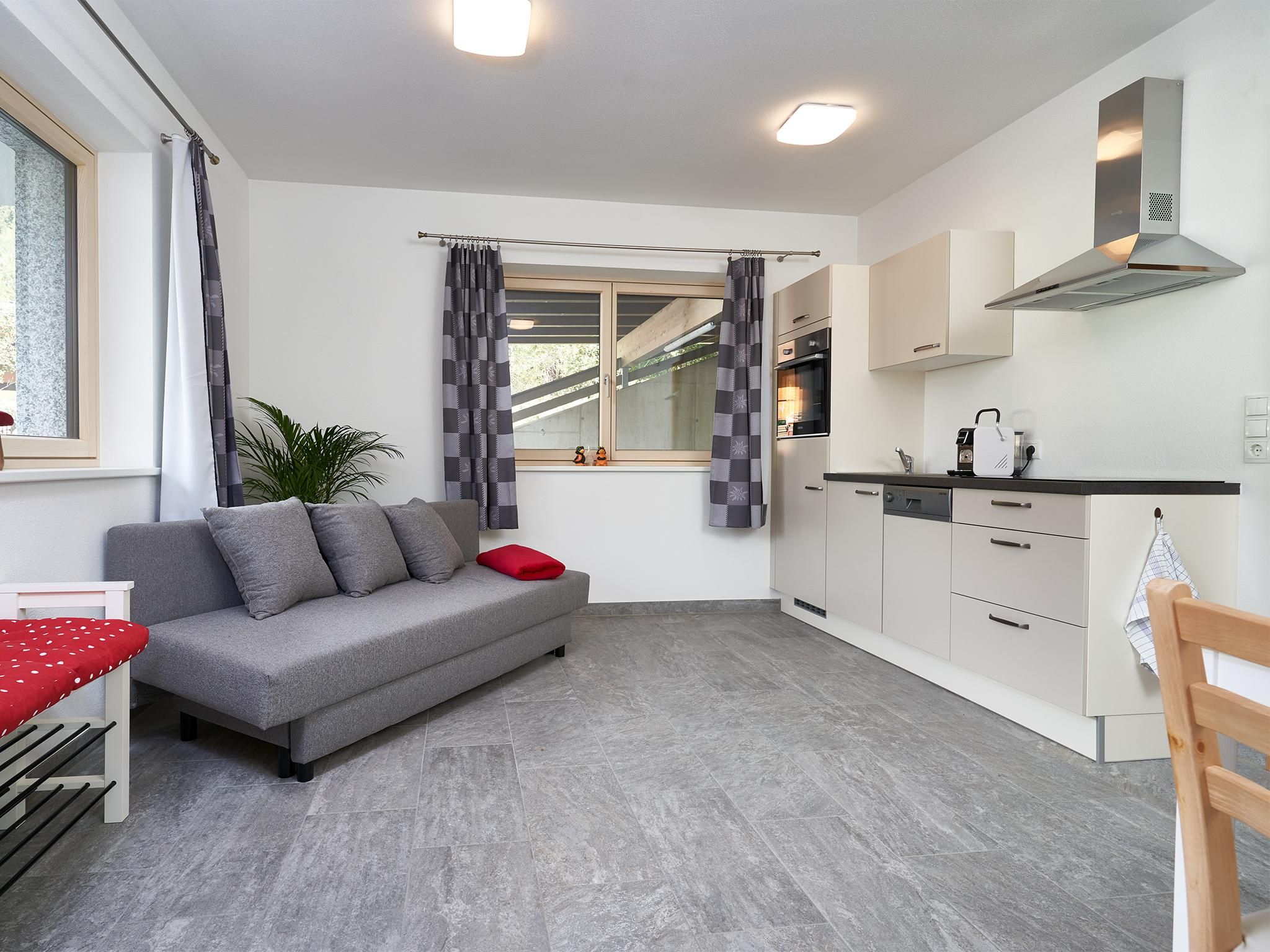 Das Appartement Arche Stuibenfall Top 1 mit ca. 48 m² befindet sich im Parterre und besteht aus: eigenem Eingang; 1 Doppelzimmer; 1 komplett ausgestatteten Wohnküche (Spülmaschine, Kaffeemaschine, Cerankochfeld uvm.) mit ausziehbaren Schlafsofa für 2 weitere Personen; 1 Badezimmer mit Dusche und WC; Zugang zur möblierten Terrasse