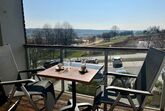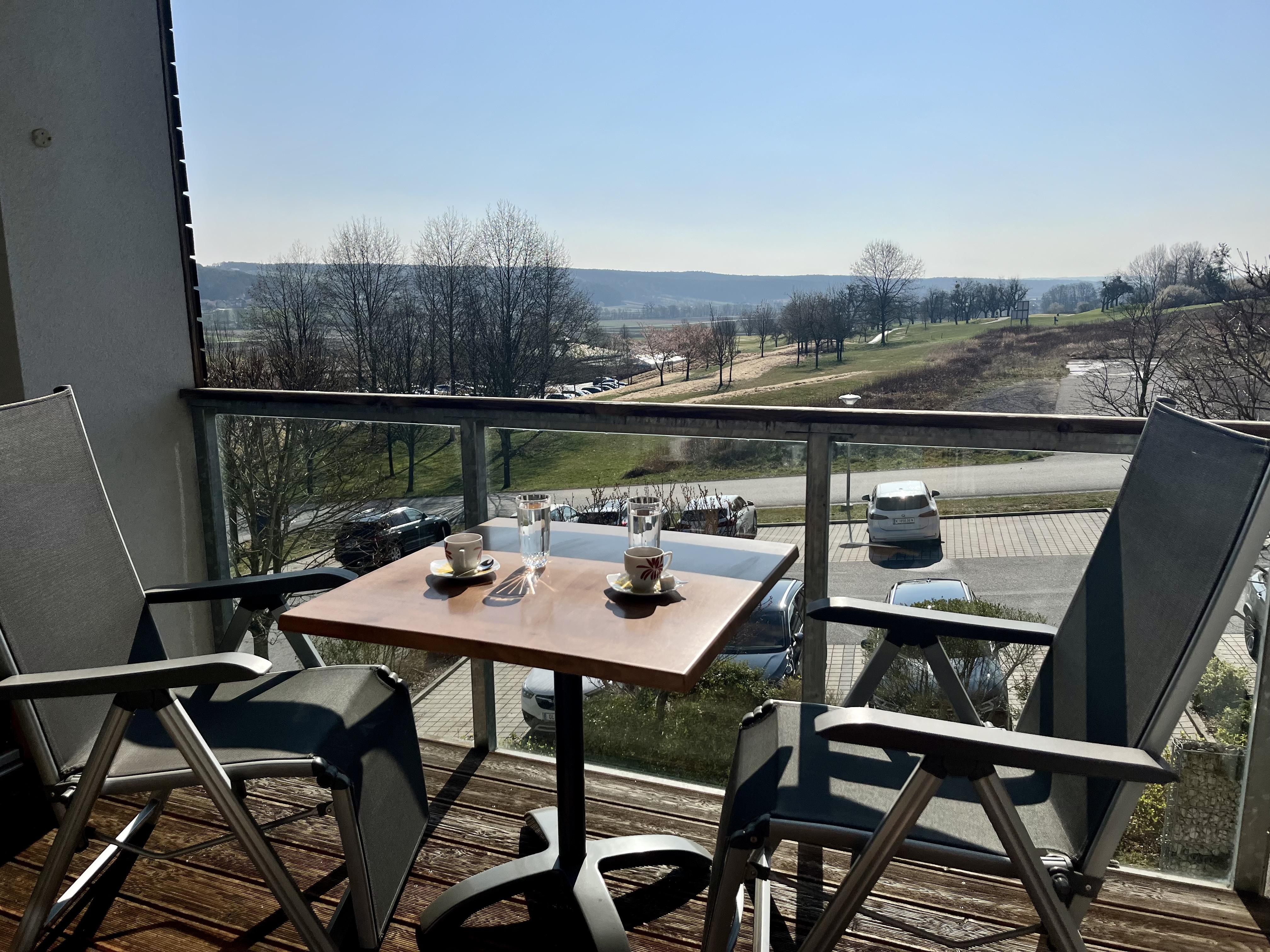 Herrlicher (Frühstücks-)Balkon mit Vormittagssonne und Blick Richtung Golfplatz.