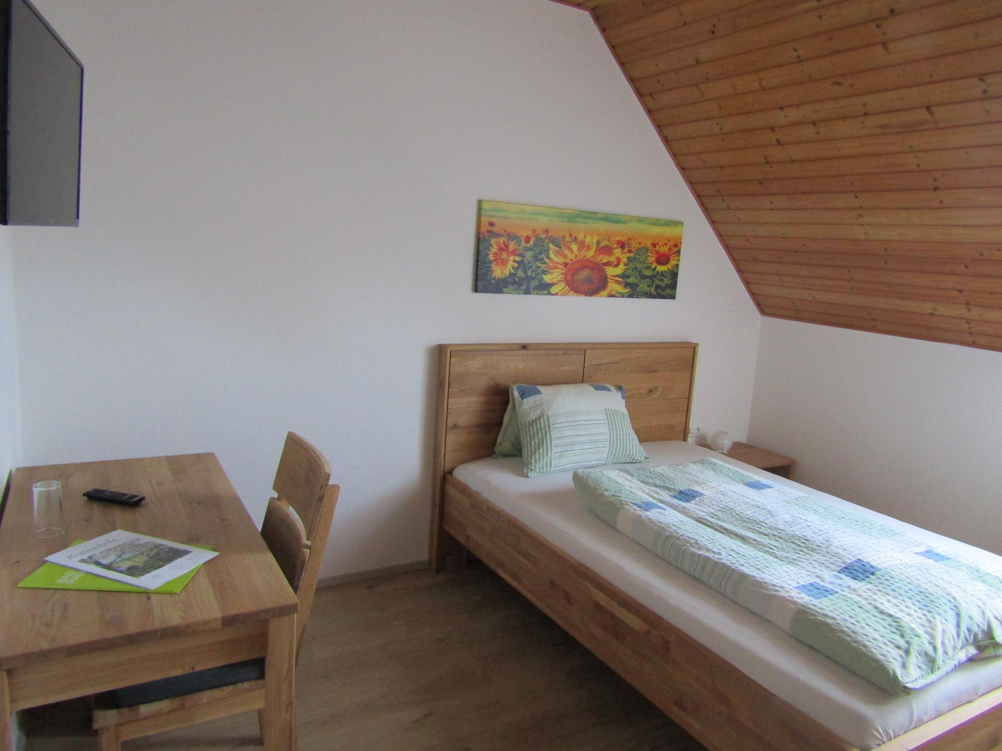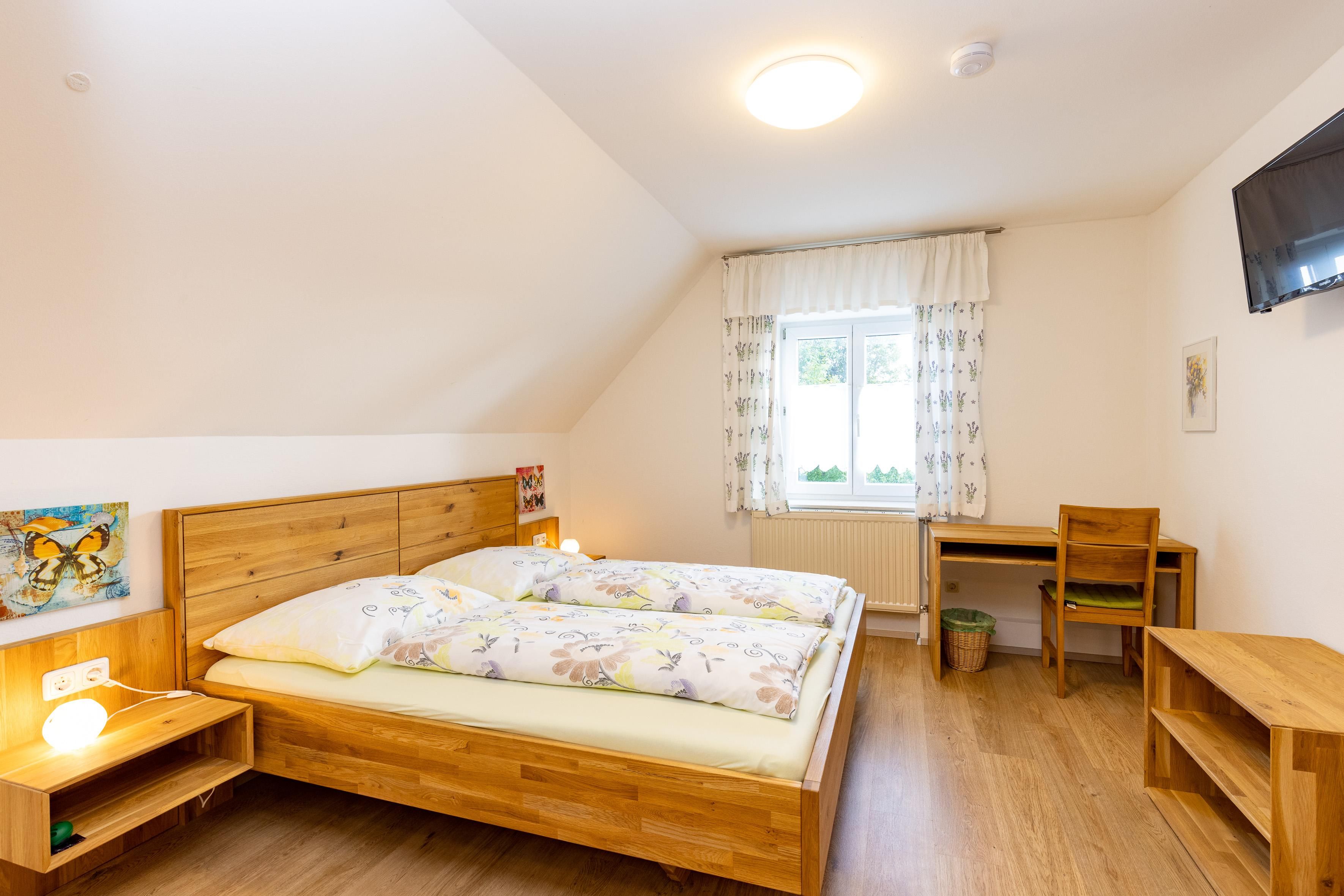 Gemütlich eingerichtetes Zimmer im Dachgeschoß unseres Bauernhauses. Das Zimmer ist mit Vollholzmöbel ausgestattet. Alle unsere Gästezimmer verfügen über einen Flachbildfernsehr, Klimaanlage, DU und WC