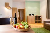 Wie die anderen Appartements ist die Küche mit Kochfeld, Kühlschrank, Geschirrspüler sowie mit Gläsern, Besteck, Tellern und Töpfen voll ausgestattet. Darüber hinaus stehen Ihnen eine Kaffeemaschine und dazugehörigen Kaffeepads sowie ein Wasserkocher mit einem Tee-Sortiment zur Verfügung.