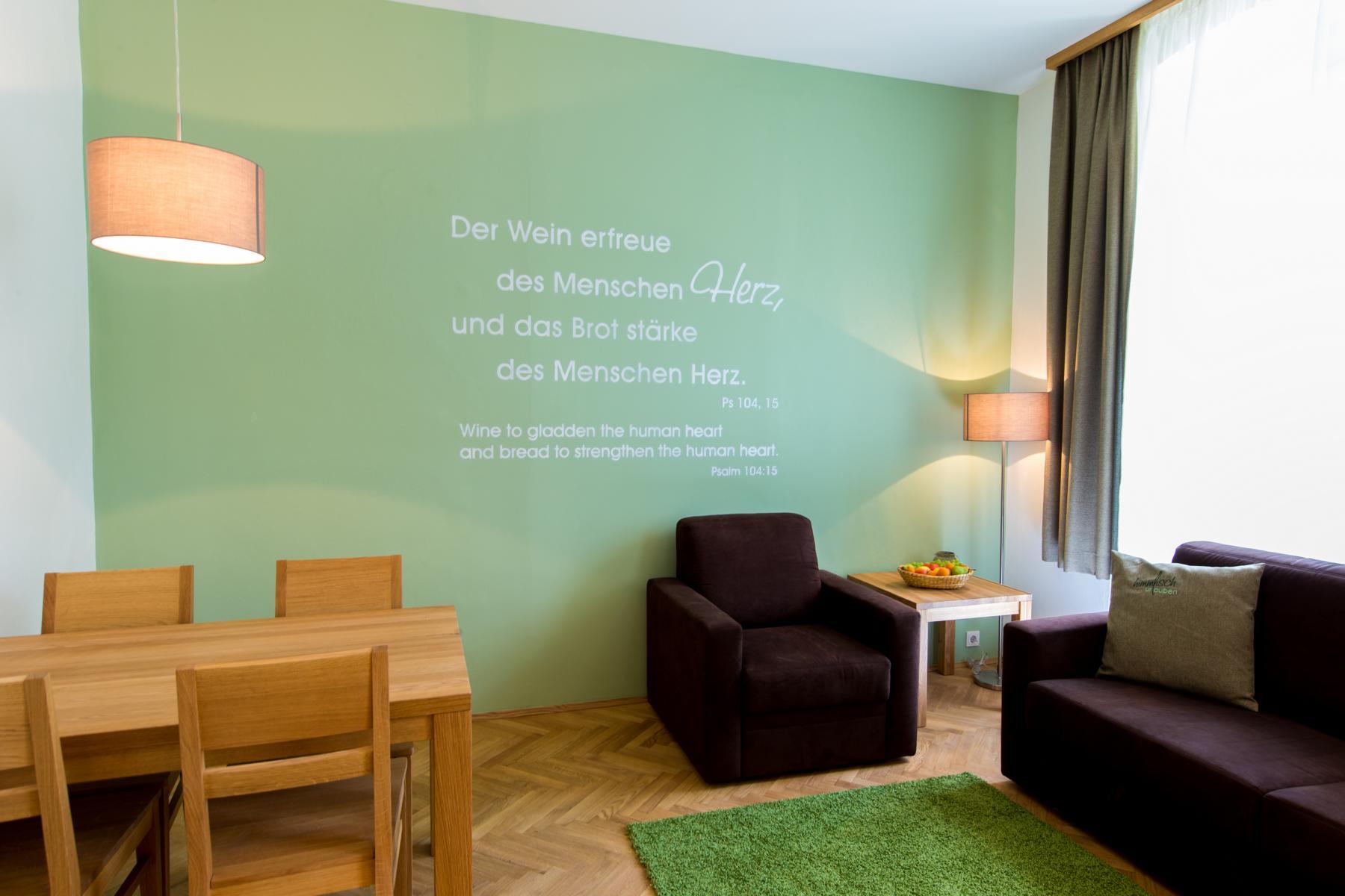 Von diesem Appartement haben Sie einen einzigartigen Ausblick: Direkt vom Wohnzimmer blicken Sie auf den Altar der angrenzenden Kirche. Viel Holz und natürliche Farben prägen das Appartement, das nach dem Pfarrpatron benannt ist. Ihre Unterkunft befindet sich im 1. Obergeschoss und bietet Ihnen eine ruhige, besinnliche Atmosphäre für zwei, maximal drei Personen.