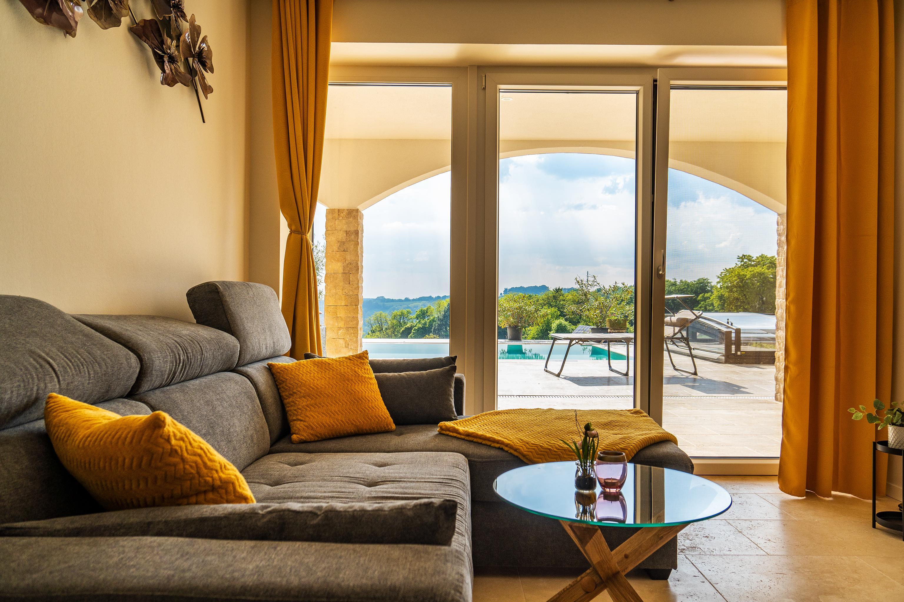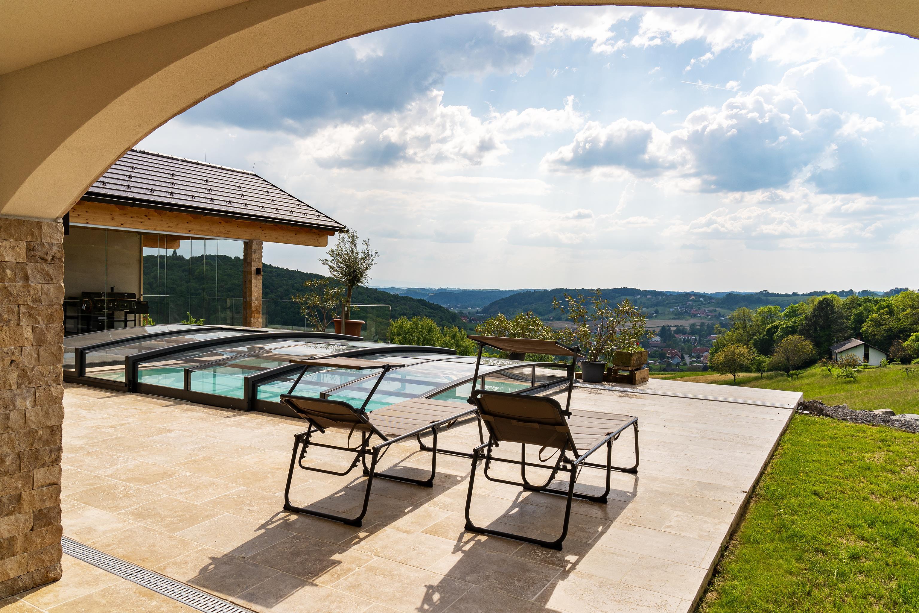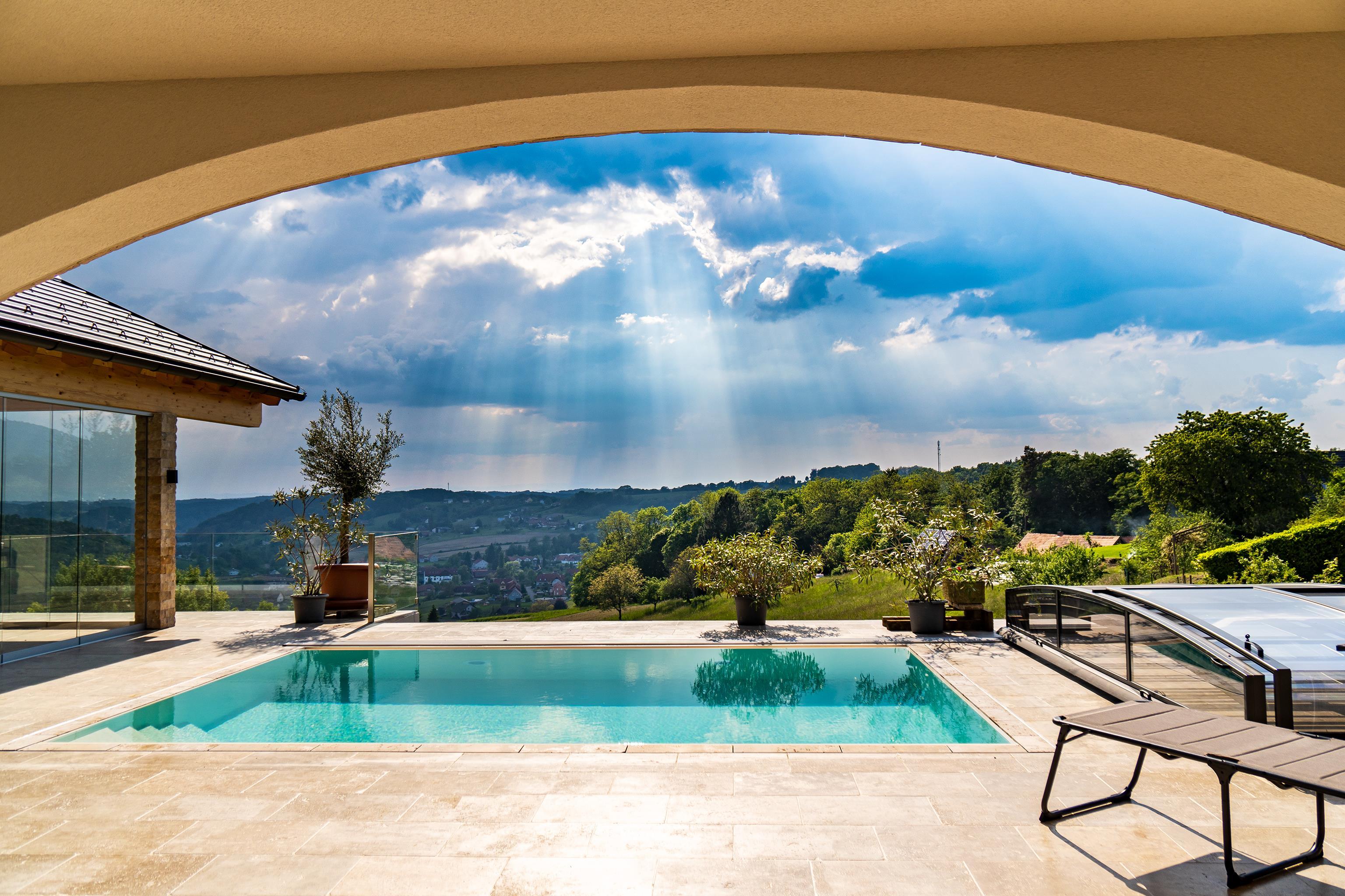 Schon beim Betreten verzaubern die großen Panoramafenster mit einem atemberaubenden Blick über den beheizten Salzwasserpool und die sanften Hügel des Thermen- & Vulkanlands – Abendstimmung inklusive.