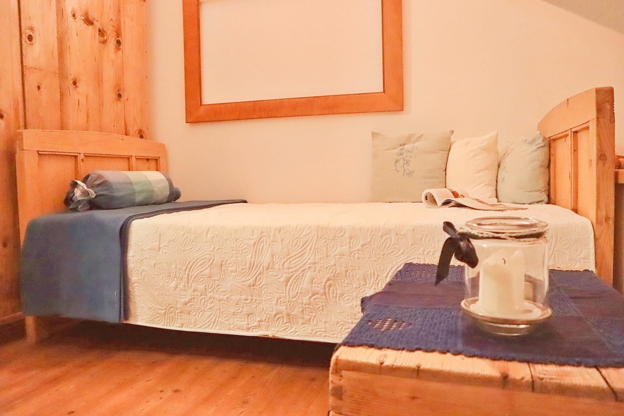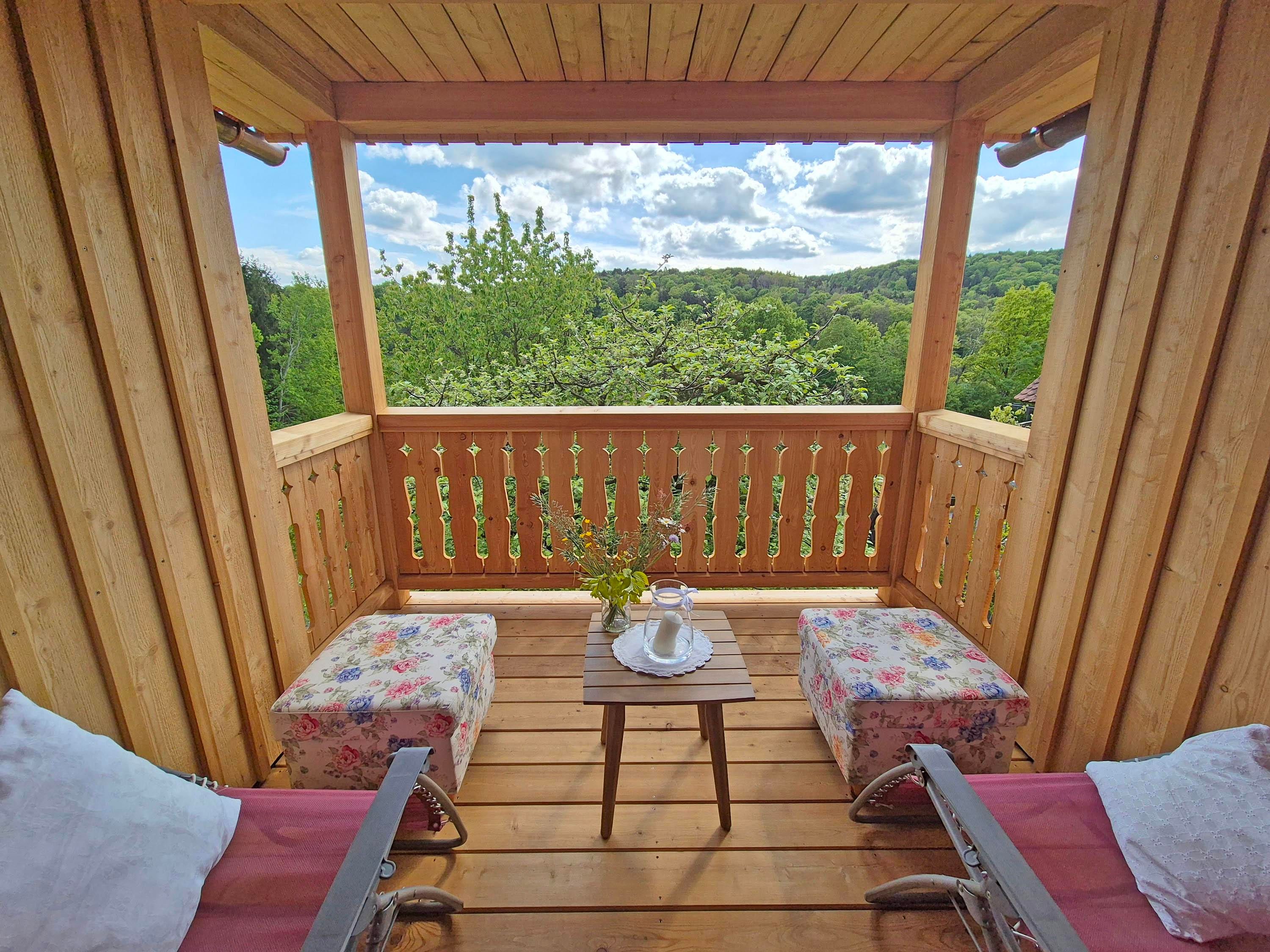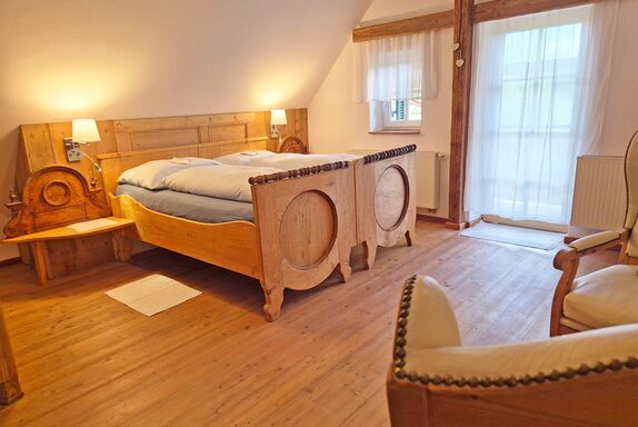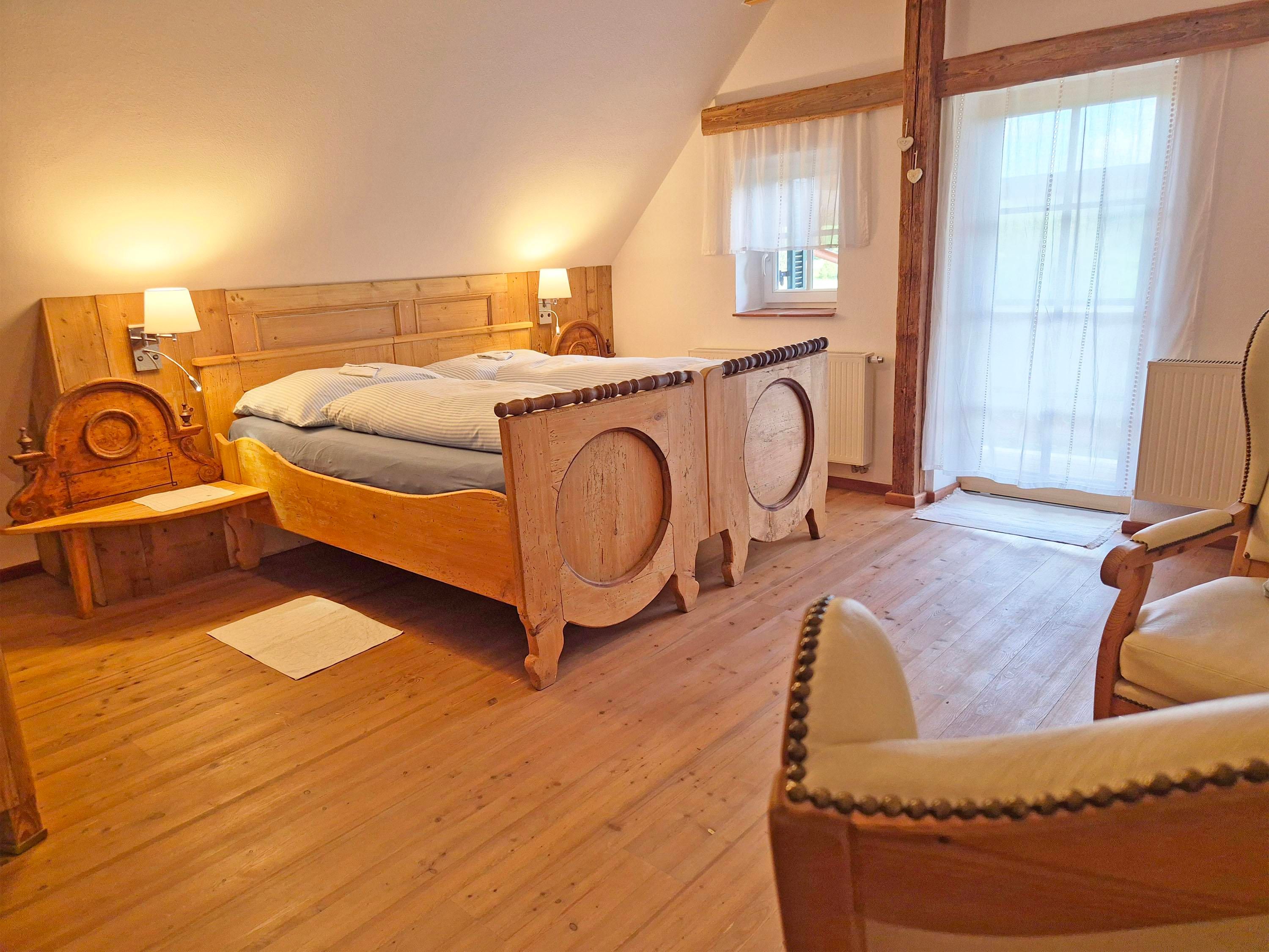 Liebevoll ausgestattetes großes Zimmer im 1. Stock mit einem antikem Doppelbett, Ohrensesselgruppe, Kühlschrank, WC, großzügige Badezimmerlösung. Privater Balkon mit Blick ins Grüne.