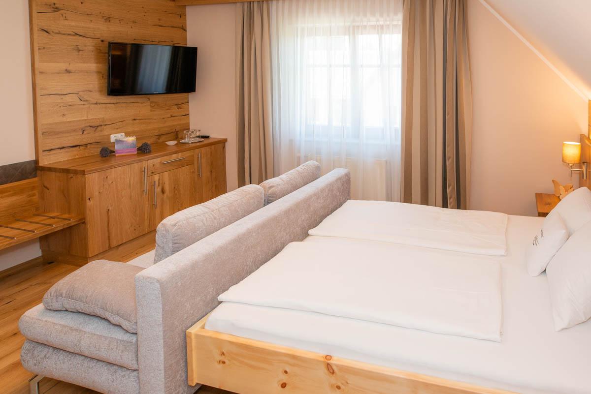 Das gemütliche, neu eingerichtete Schlafzimmer ist jetzt mit einem Zirbenbett und zusätzlich mit SAT-TV ausgestattet.