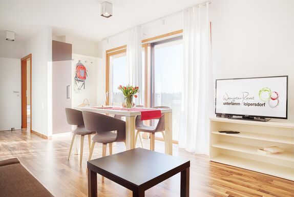 Schier unendliche Weinreihen, die sich wie Perlen an einer Kette aneinanderreihen. Die sanfte Hügellandschaft der Südoststeiermark. Und mittendrin das Weingarten-Resort Unterlamm Loipersdorf. Wenn moderne Architektur und unberührte Naturlandschaften aufeinander treffen, dann ist man angekommen im Weinurlaub im Süden Österreichs. Die absolute Ruhelage begeistert Erholungssuchende von der ersten Minute an. Hier ist man auf „Du und Du“ mit der Natur. Alleine und doch bleiben keine Wünsche offen! Insgesamt erwarten vier exklusive Ferienhäuser unsere Gäste aus Nah und Fern. Jedes WeinHAUS zeichnet sich dabei durch klare Linien, ein gemütliches Ambiente und einen Urlaub mit Hotel-Komfort aus. Für noch mehr Privatsphäre sorgt die großzügige Sonnenterrasse mit 55 Quadratmetern, mit der jedes WeinHAUS ausgestattet ist. Im Inneren der Premium Apartments stehen auf 40 Quadratmetern zwei Schlafräume, eine Designer Küche und ein modernes Duschbad mit Regendusche bereit. Nicht zu vergessen der grandiose Ausblick auf die umliegenden Weinberge. Die großen Fensterfronten lassen innen und außen, Natur und Wohnen, zu einem großen Ganzen verschmelzen. Entspannte Tage stehen Ihnen bevor, herzlich willkommen im Weinurlaub!