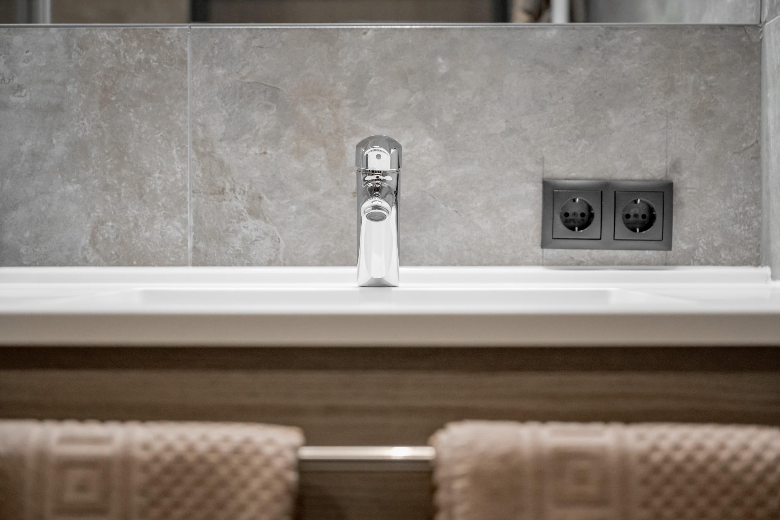 1 Badezimmer mit Dusche, Waschbecken, Föhn und WC