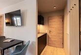 Unser Ministudio Watery für 2 Personen verfügt über ein komfortables Boxspringbett, helles Badezimmer mit Regendusche, moderne Kitchenette (mit Mikrowelle, Kühl-/Gefrierschrank, Geschirr, Besteck), Essbereich, gr. Balkon, Smart TV, WIFI.