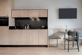 Der offene Wohn- und Schlafbereich, das Badezimmer und die vollfunktionale Küche lassen keine Wünsche offen – alles in klaren Formen und natürlichen Materialien gehalten.