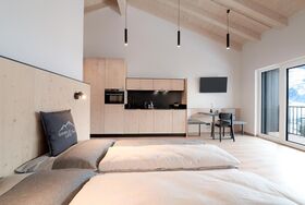 Klare, hochwertige, lichtdurchflutete, minimalistische Apartments mit großen Fensterfronten für den optimalen Ausblick auf unsere wunderschönen Berge und Skipisten! - direkt vor der Türe!