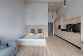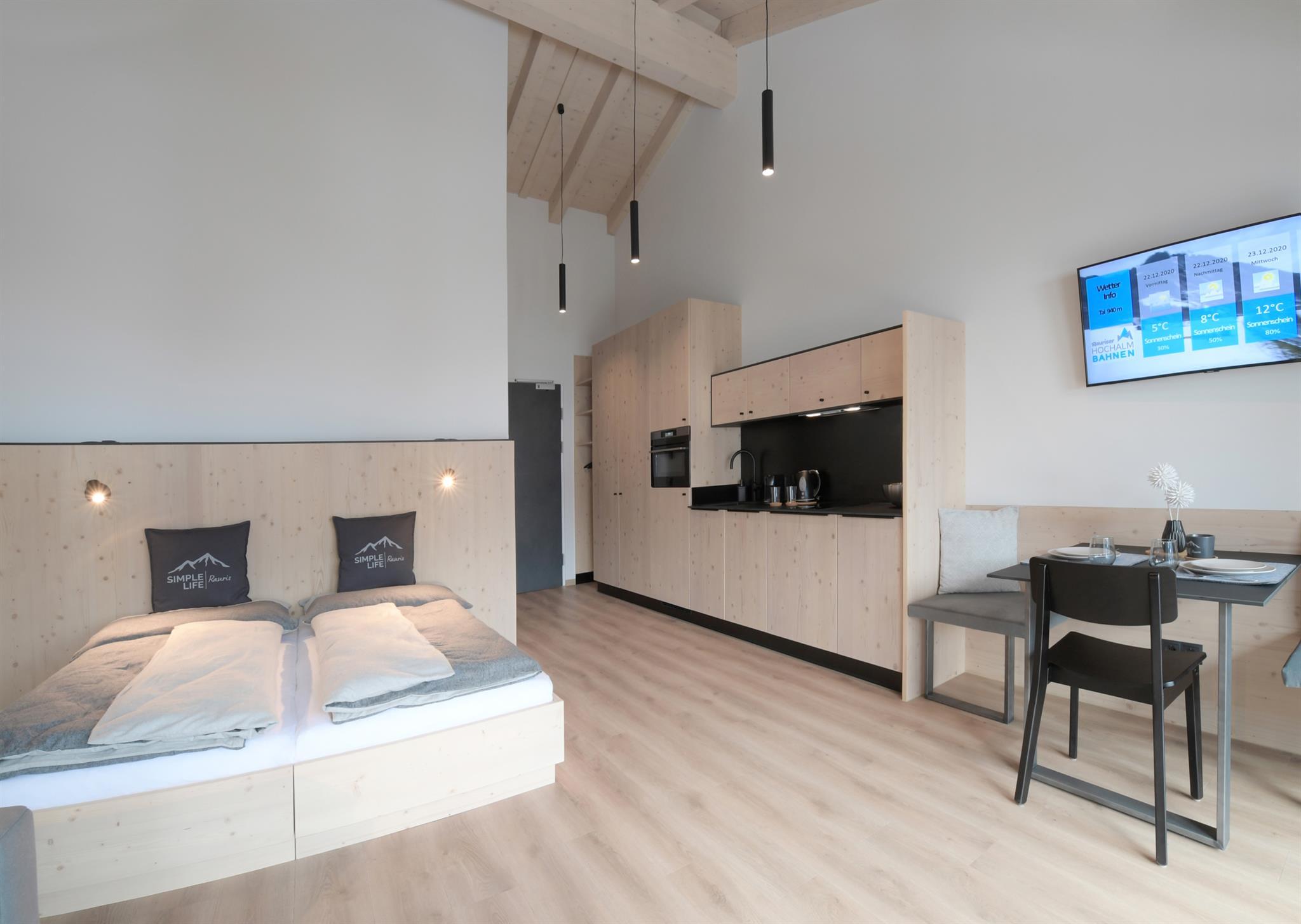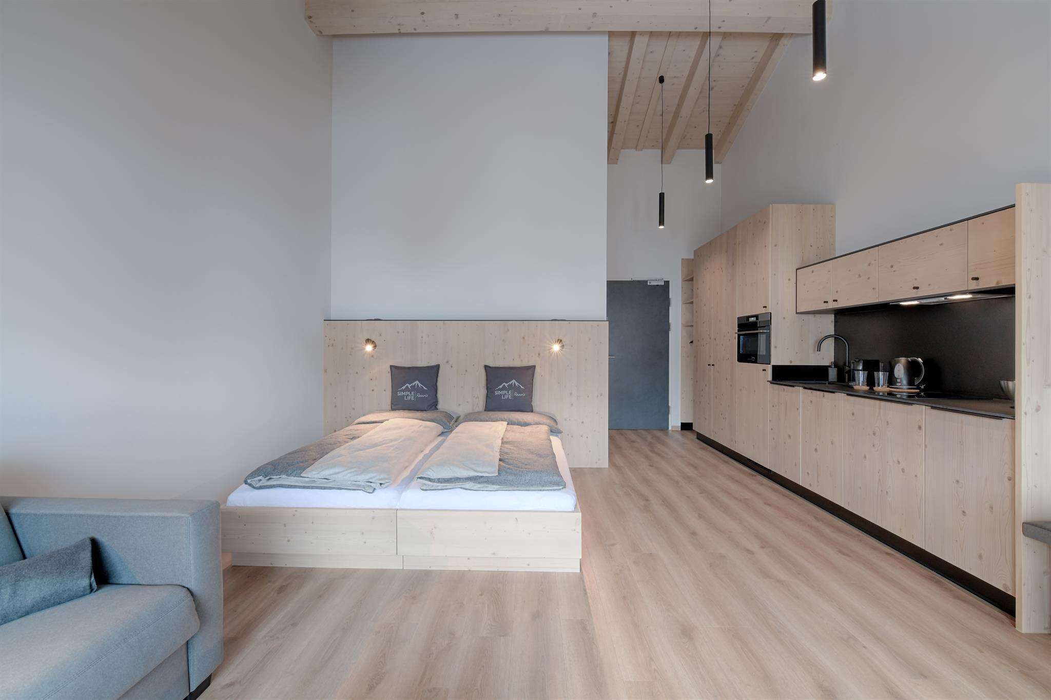 Der offene Wohn- und Schlafbereich, das Badezimmer und die vollfunktionale Küche lassen keine Wünsche offen – alles in klaren Formen und natürlichen Materialien gehalten.