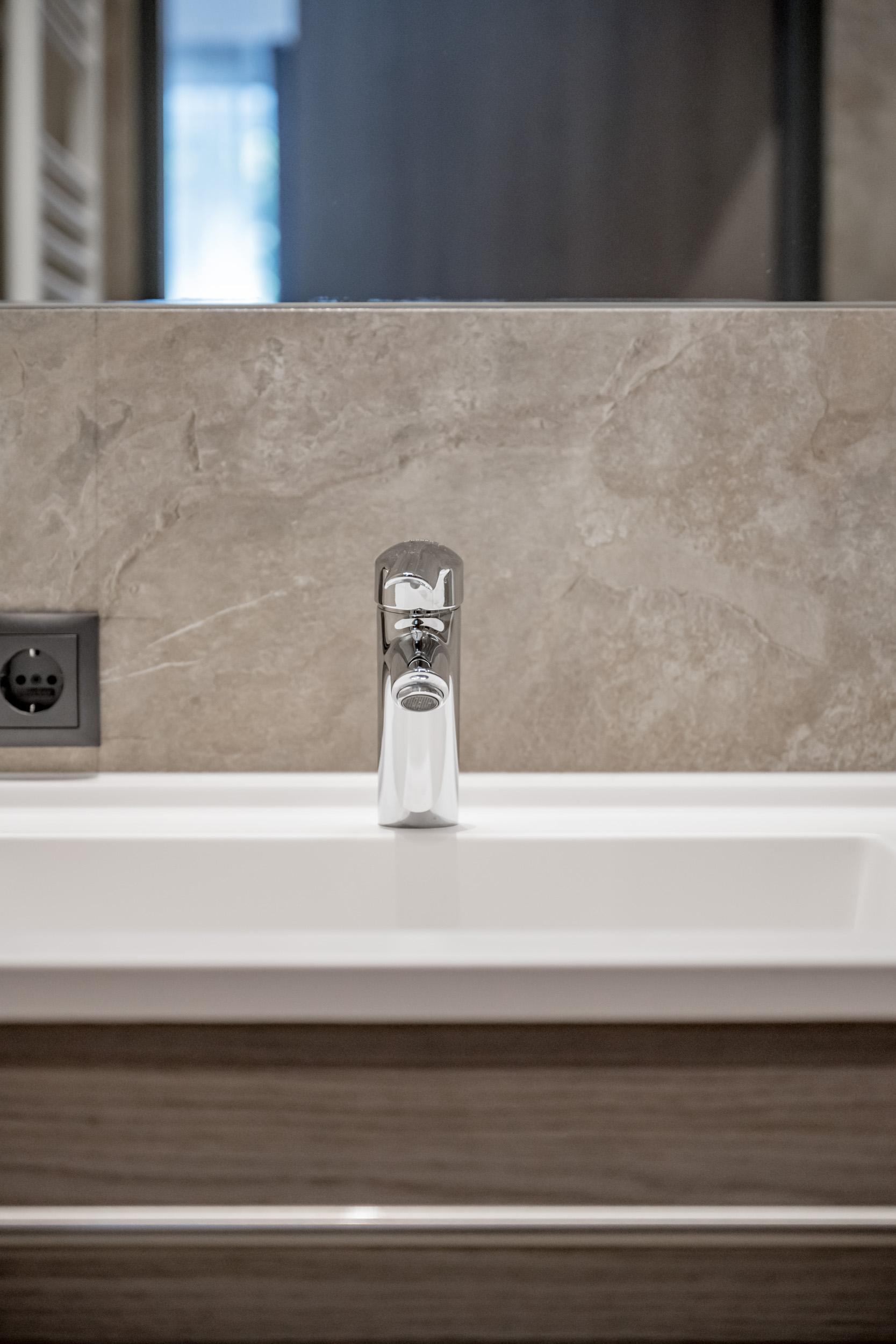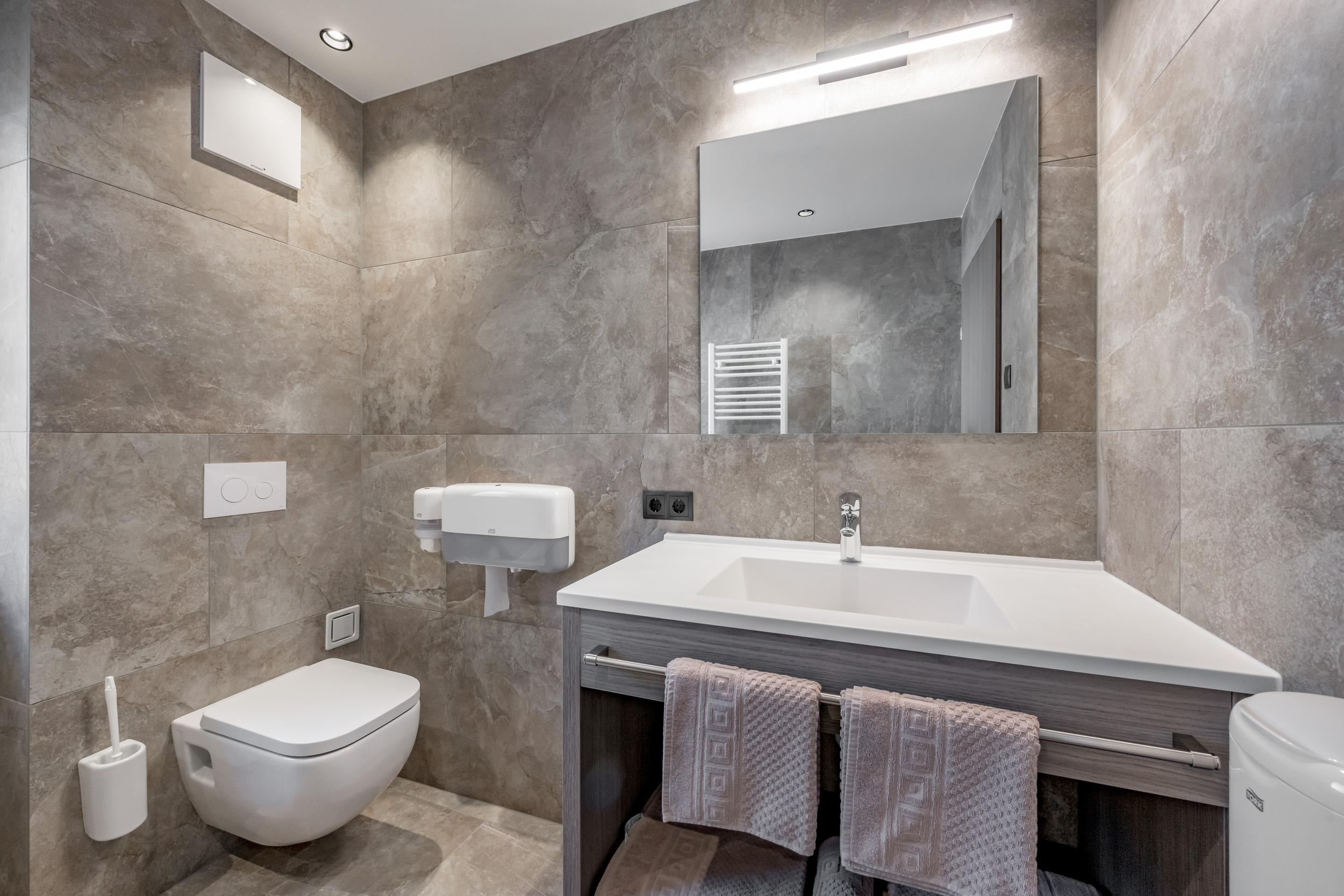 1 Badezimmer mit Dusche, Waschbecken, Föhn und getrenntes WC