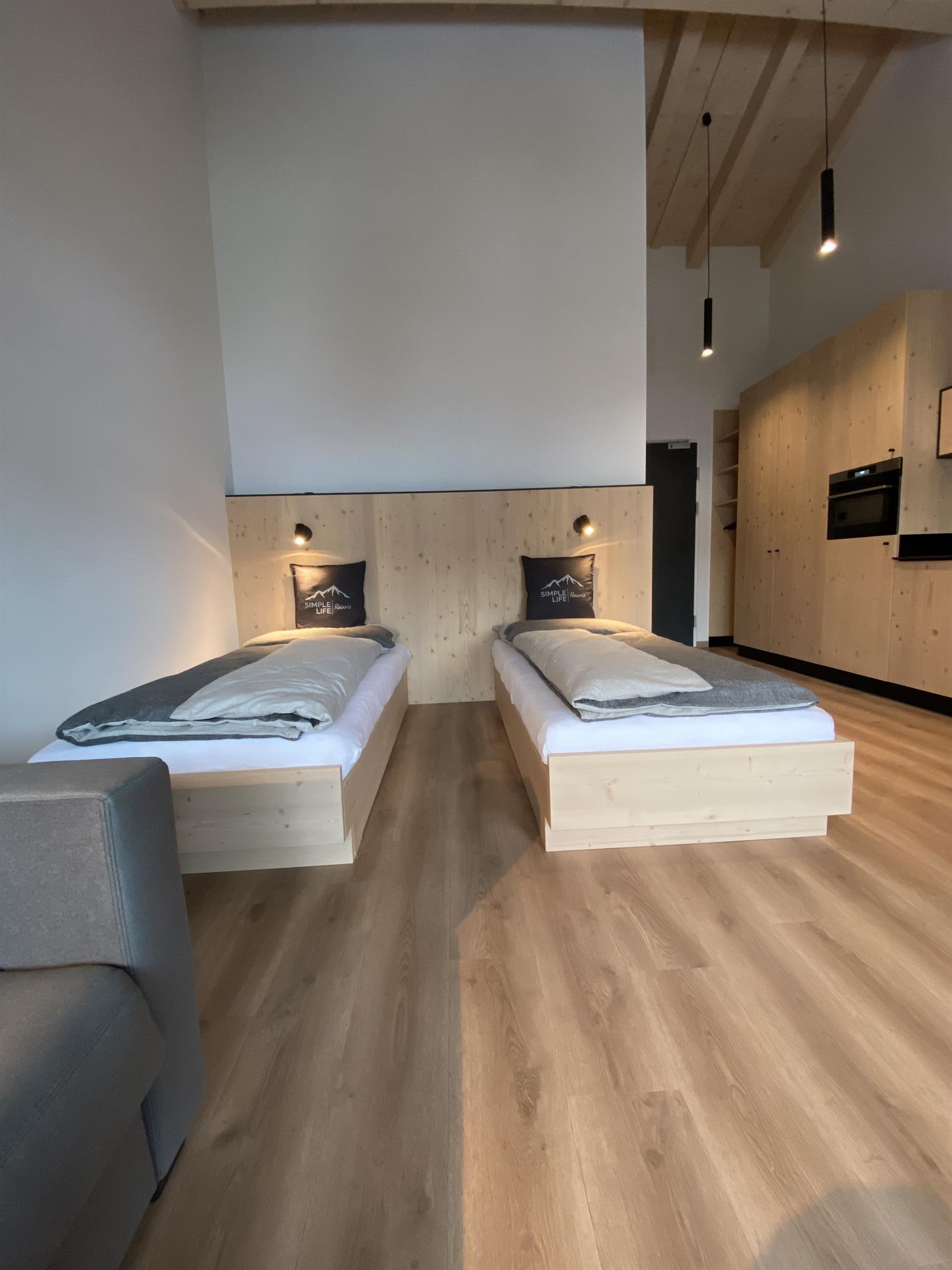 Unsere großzügigen 1 Zimmer Apartments punkten mit trennbaren Doppelbett, gratis WLAN, neueste Technologie (elektronischem Zutrittssystem, mobiler Handy Schlüssel), großen Terrassen oder Balkonen und einem besonders angenehmen Raumklima durch den kompletten Massivholzbau.
