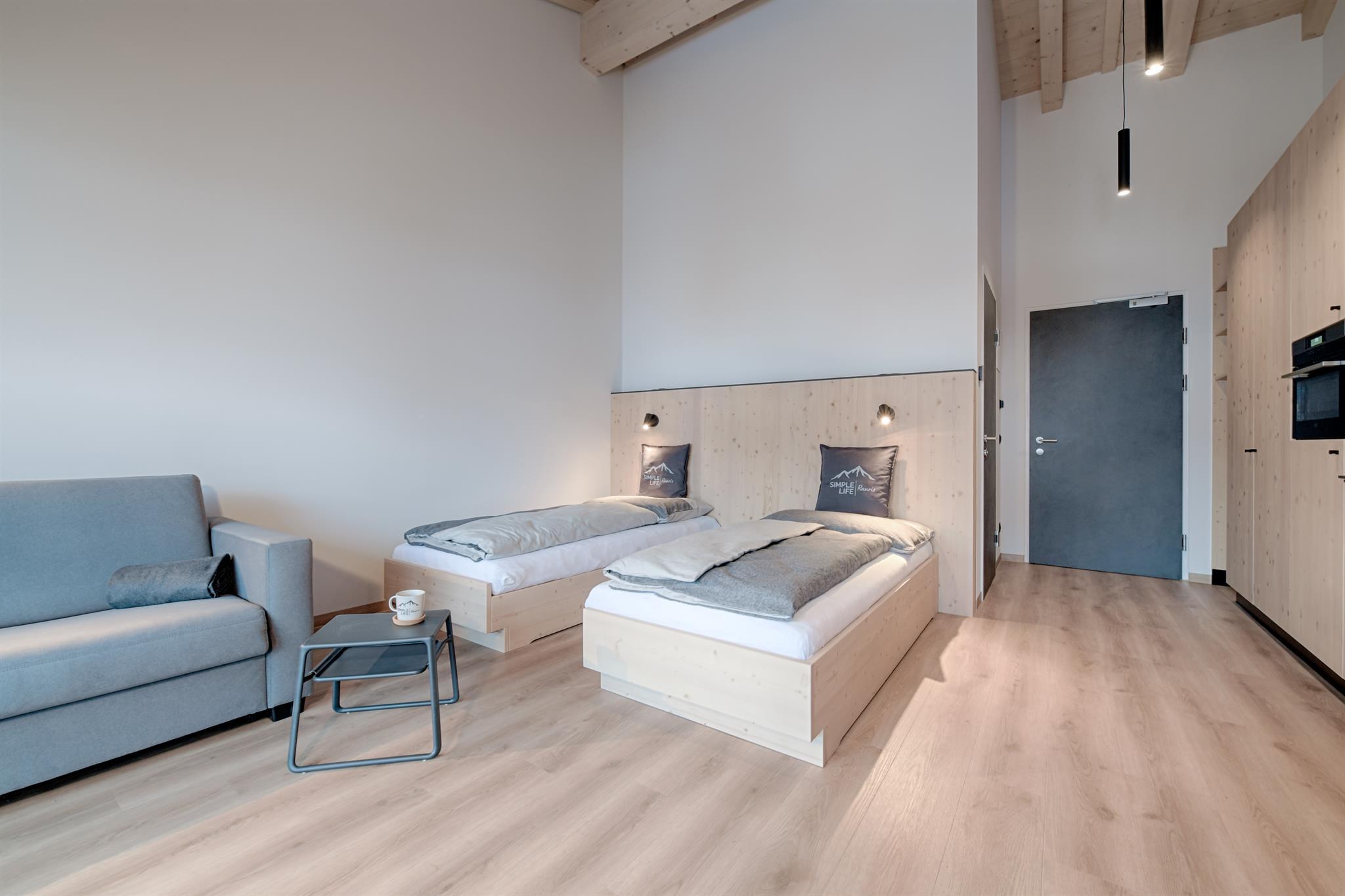 1 Zimmer Apartments für 2 Personen; eine 3. Person oder Kinder ab 14 Jahren finden auch noch auf der großen Schlafcouch Platz.