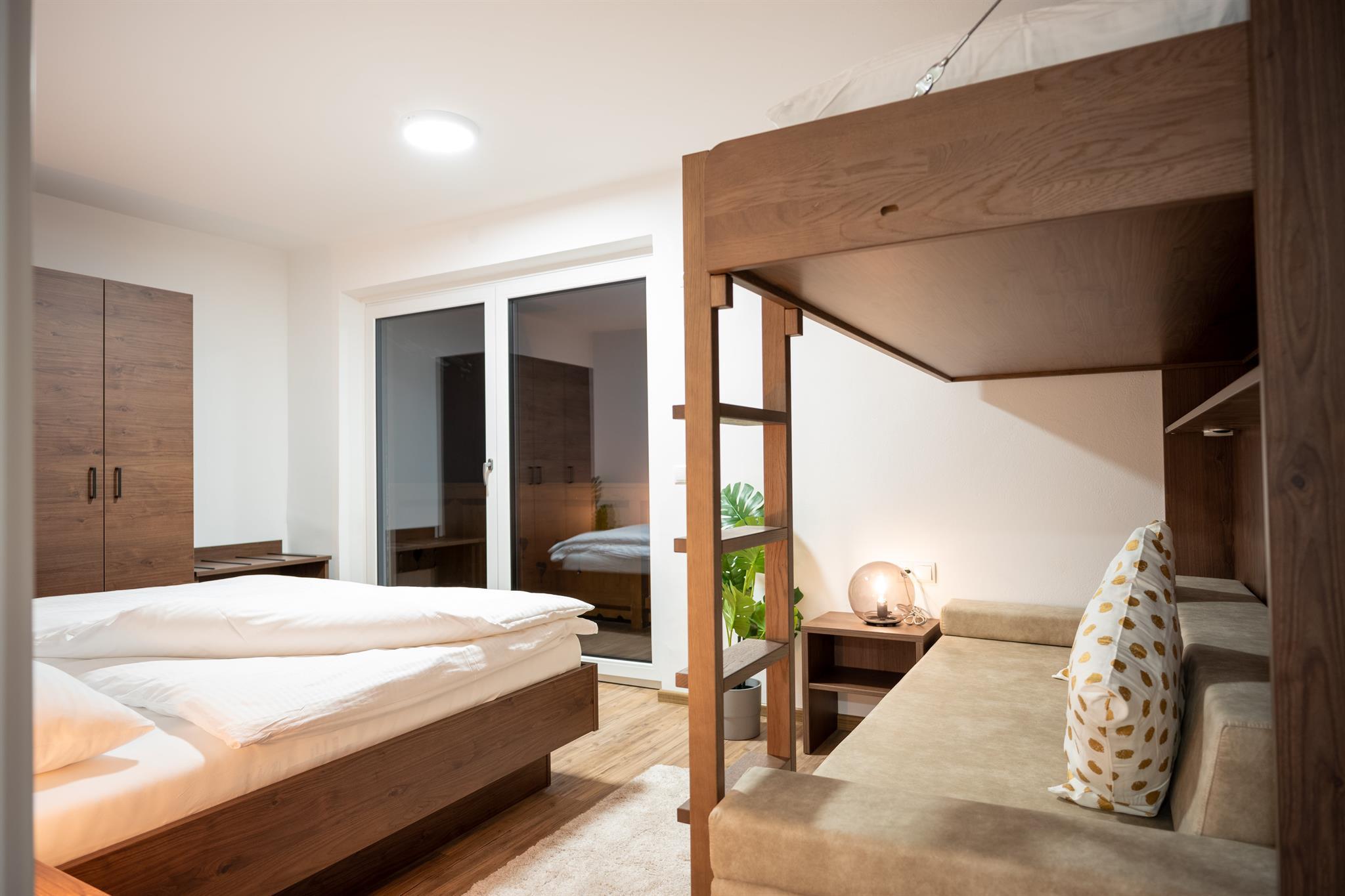 Unser Family Apartment eignet sich perfekt für Familien mit bis zu 10 Personen. Die 70m² teilen sich in zwei Schlafzimmer, sowie in ein Wohnzimmer auf. Während wir die Schlafzimmer mit je einem großen Doppelbett und verstaubaren Etagenbetten ausgestattet haben, gibt es im Wohnzimmer eine weitere Schlafcouch für zwei Personen. Zusätzlich bietet das Apartment zwei brandneue Badezimmer und eine weitere, separate Toilette. In jedem Fall kommen unsere Gäste in den Genuss von kostenfreiem W-Lan und zwei privaten Parkplätzen vor dem Haus. Im Garten haben wir zusätzlich eine gemütliche Sitzgarnitur und einen Grillplatz eingerichtet.