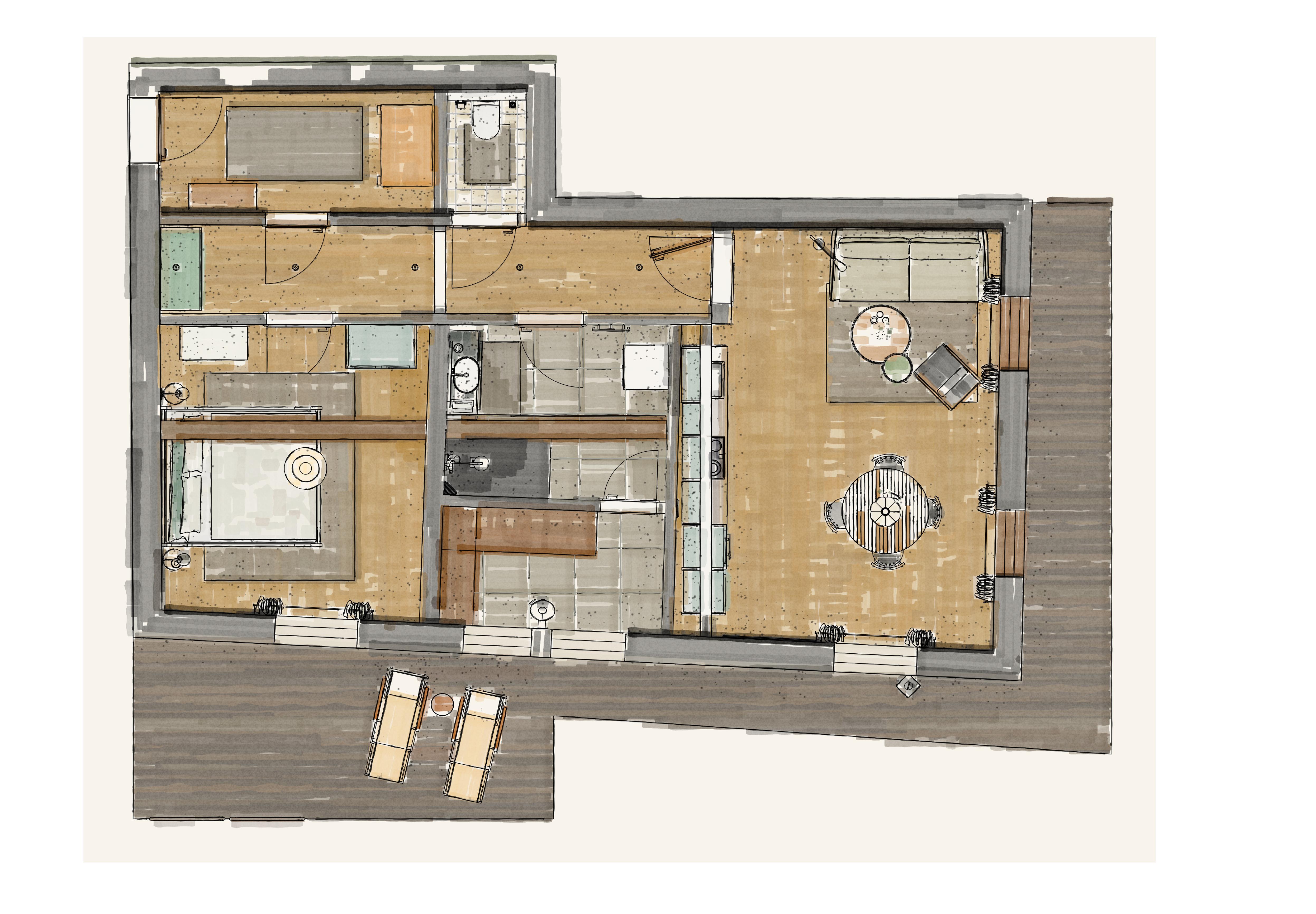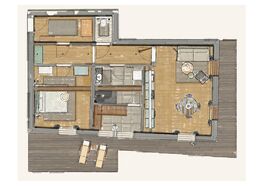 • Wohnküche, mit vollausgestattete Küche (Geschirrspüler, Kühlschrank, Kaffeemaschine mit Tabs, Herd mit Ceranfeld und Backrohr, Spüle, Toaster, Geschirrtücher, Kochgeschirr & Essgeschirr, Besteck, Gläser usw.)