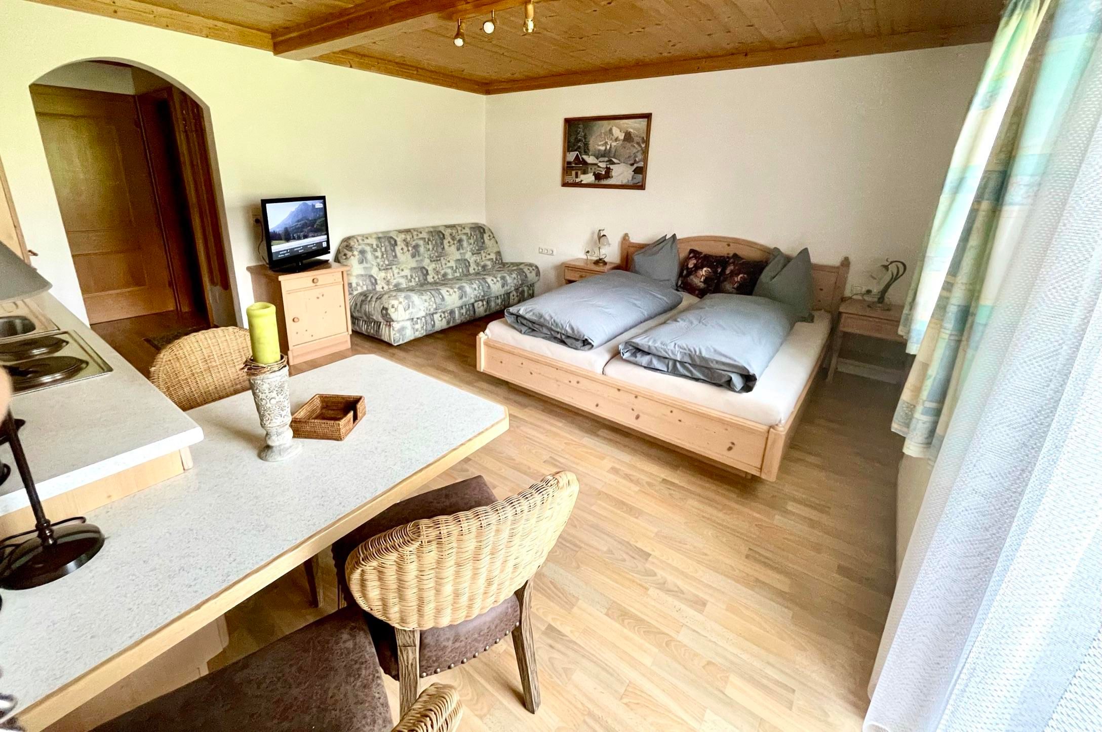 • Wohnraum mit ausziehbarer Couch für 2 Personen, eigener Balkon und Terrasse