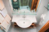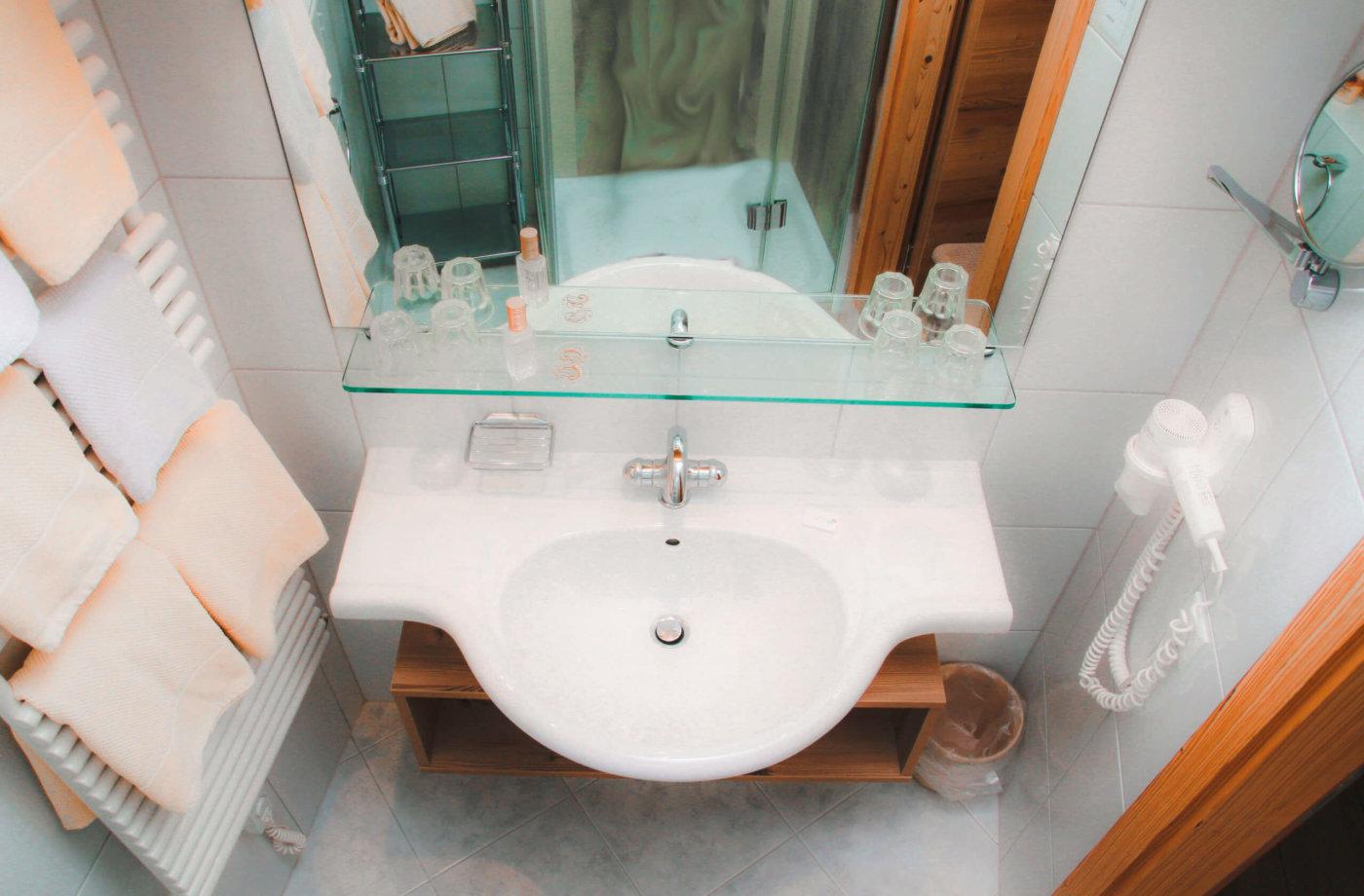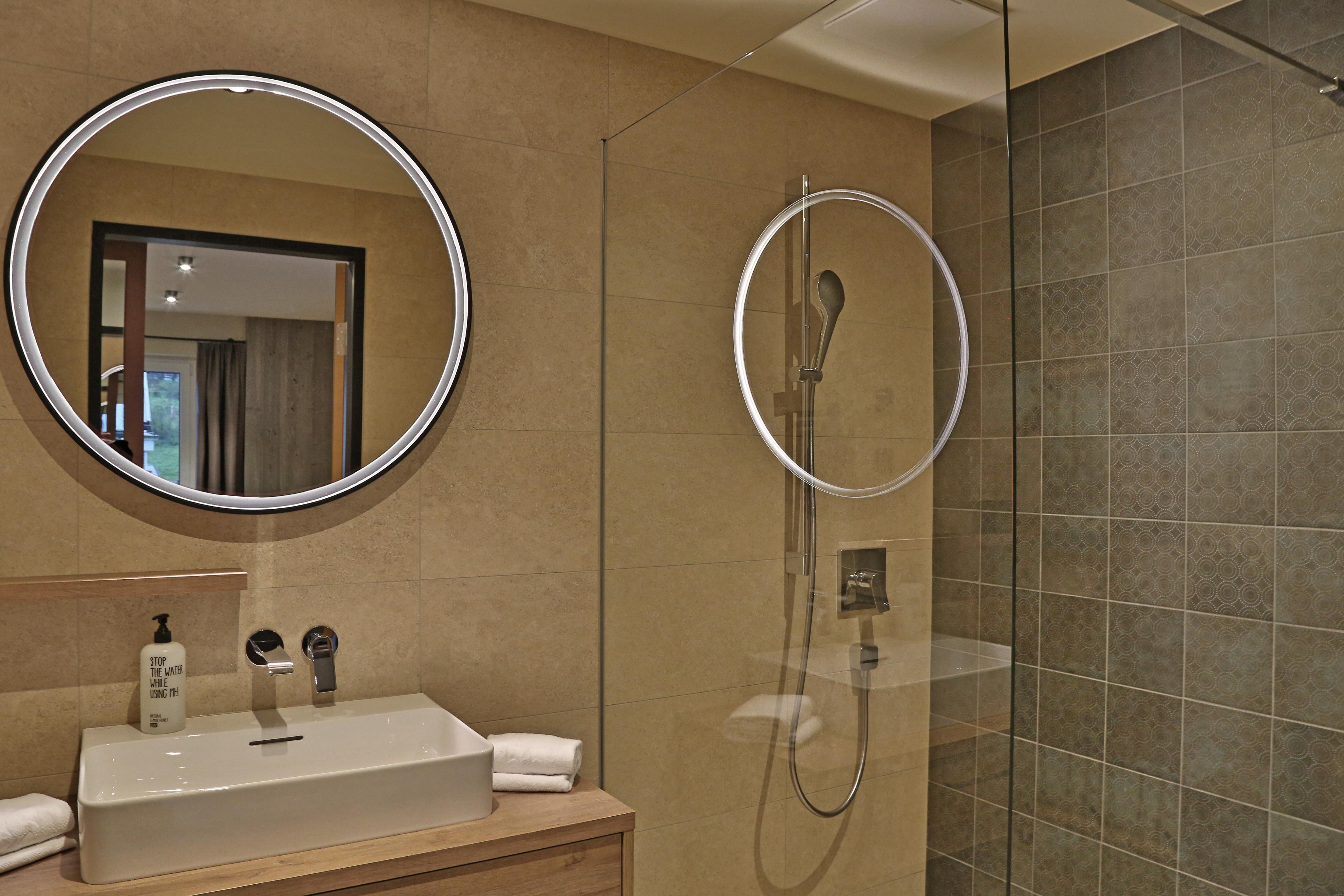 • Badezimmer mit Dusche sowie Handtuchtrockner und Haarföhn, separates WC