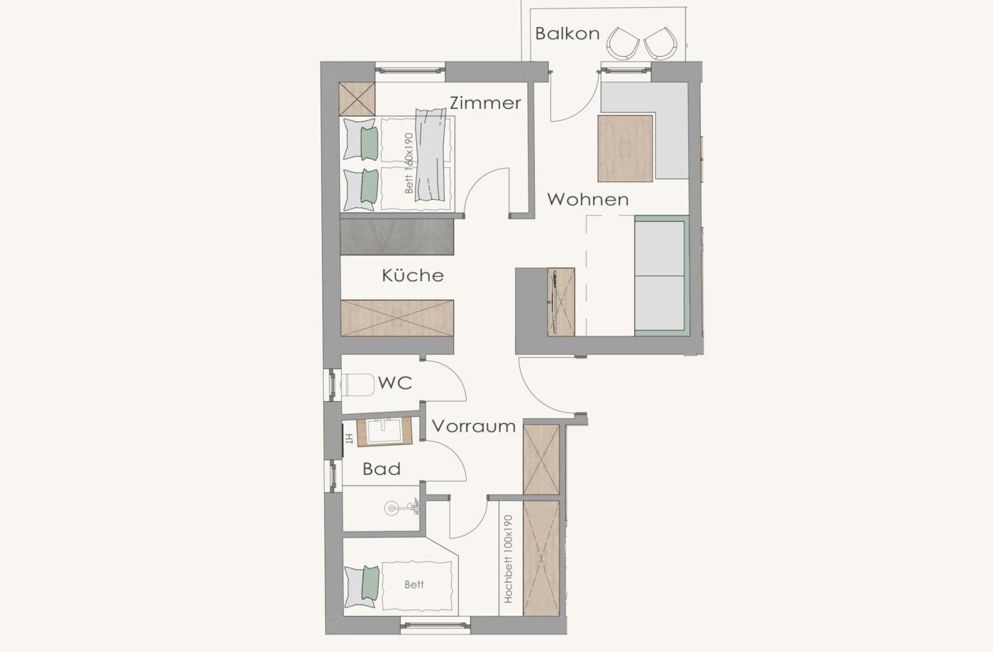 • 2 Schlafzimmer mit 1 Bett 120 x 190 cm und 1 Bett mit 90 x 200 cm (Hochbett)
