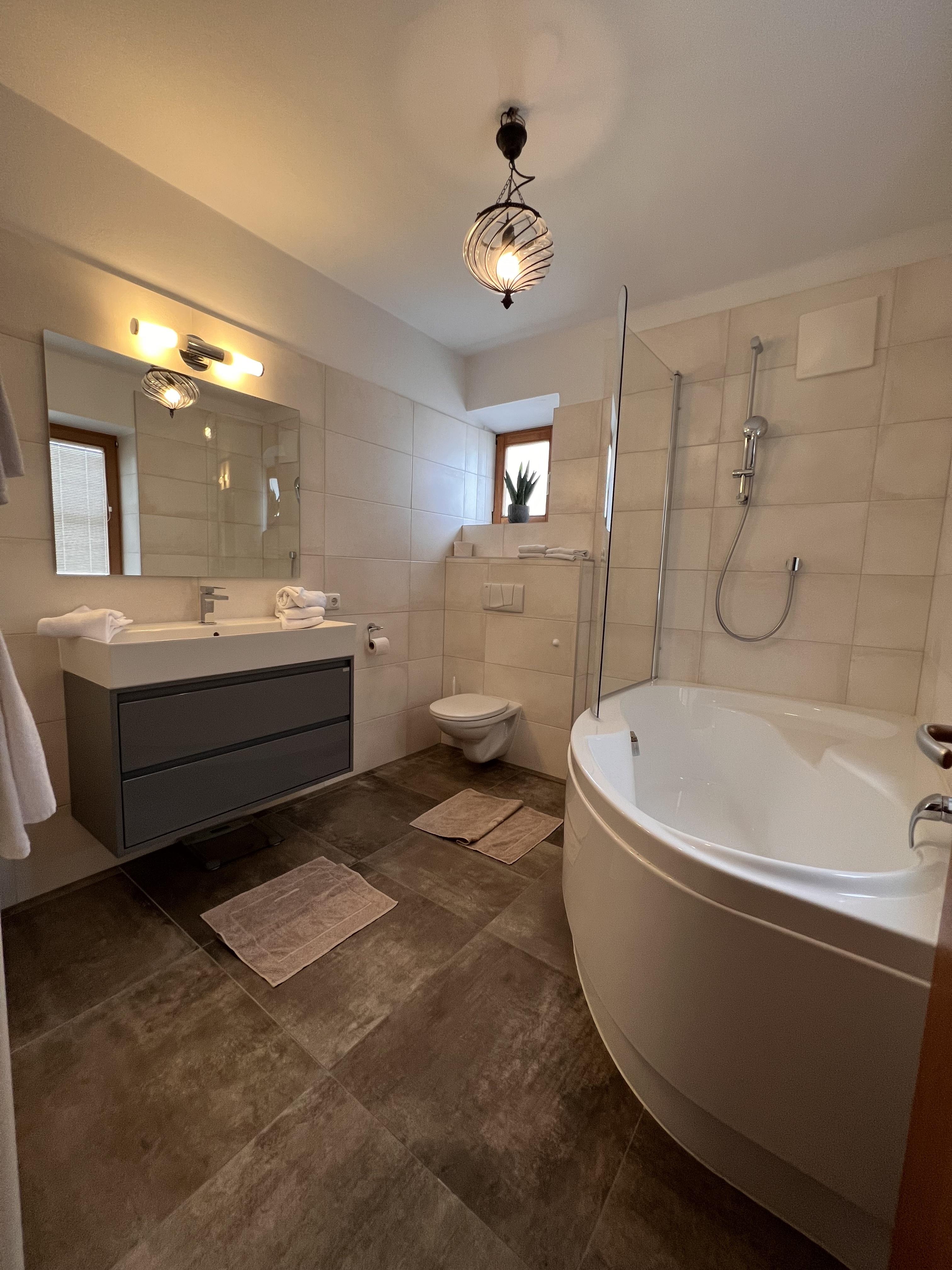 • 1 Badezimmer mit Duschbadewanne, WC, Handtuchtrockner und Haarföhn
