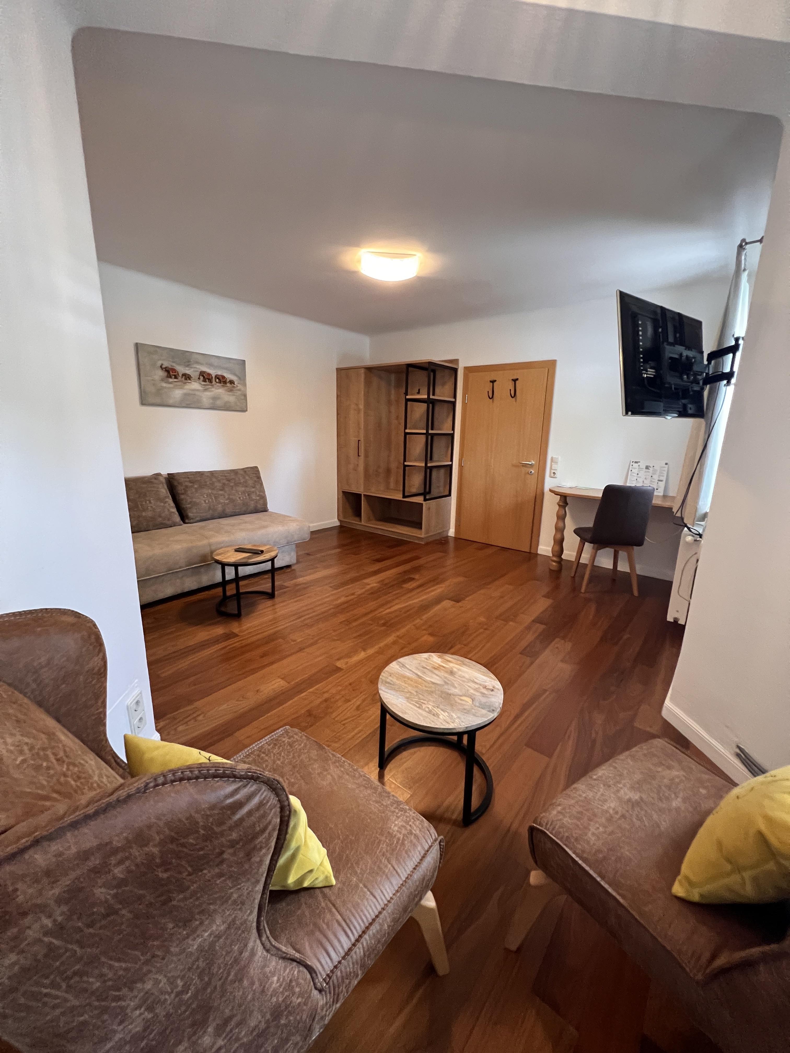 • Geräumiges Wohnzimmer mit Flat-TV und hochwertigem Schlafsofa für 1-2 Personen 160 x 200 cm